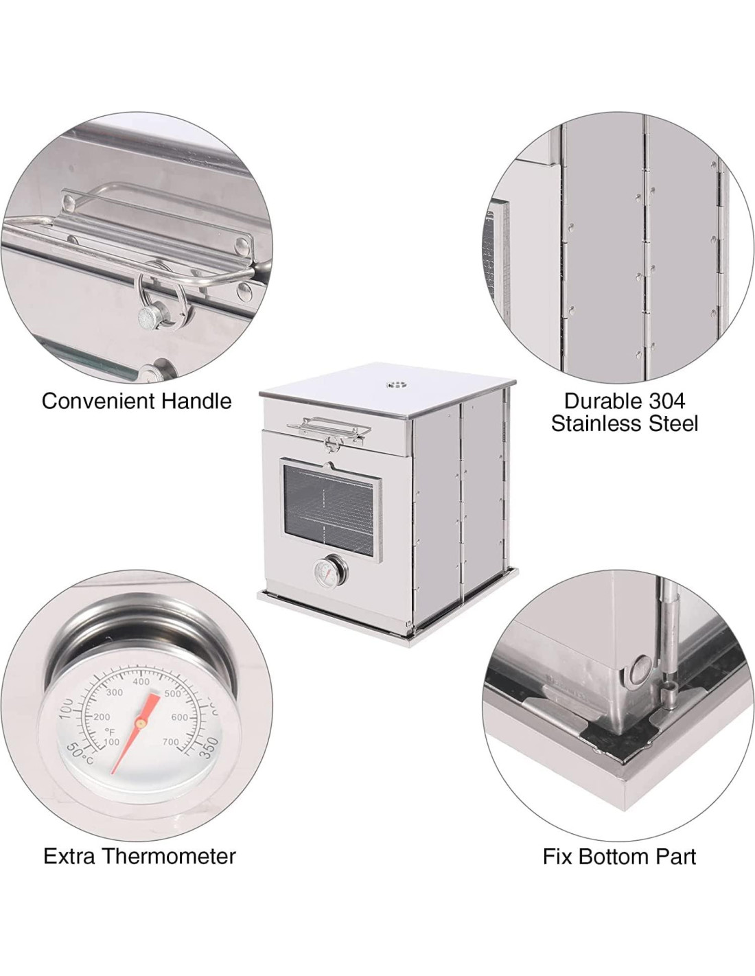 - Material Premium: El horno de camping está hecho de acero inoxidable 304, que es duradero y resistente a la corrosión. Es lo suficientemente robusto para sostener alimentos mientras la conexión es ajustada con hebillas fijas.