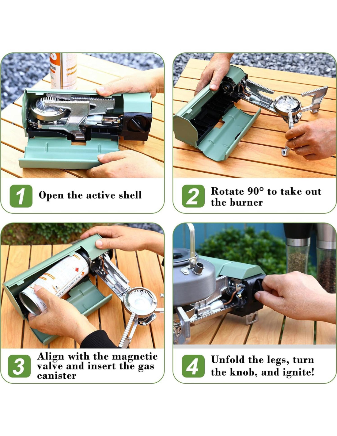 - [Protección de Seguridad de Múltiples Capas] La estufa exterior cuenta con múltiples protecciones de seguridad. La válvula magnética asegura la correcta instalación del cartucho, bloqueándolo de forma segura en solo un segundo. Un diseño anti-fugas que bloquea la inserción de gas cuando el interruptor está abierto, y una válvula de protección contra sobrepresión que corta automáticamente el gas si la presión se vuelve demasiado alta. ¡Mantente seguro mientras cocinas al aire libre! Compatible con cartuchos de combustible de butano de 8oz.