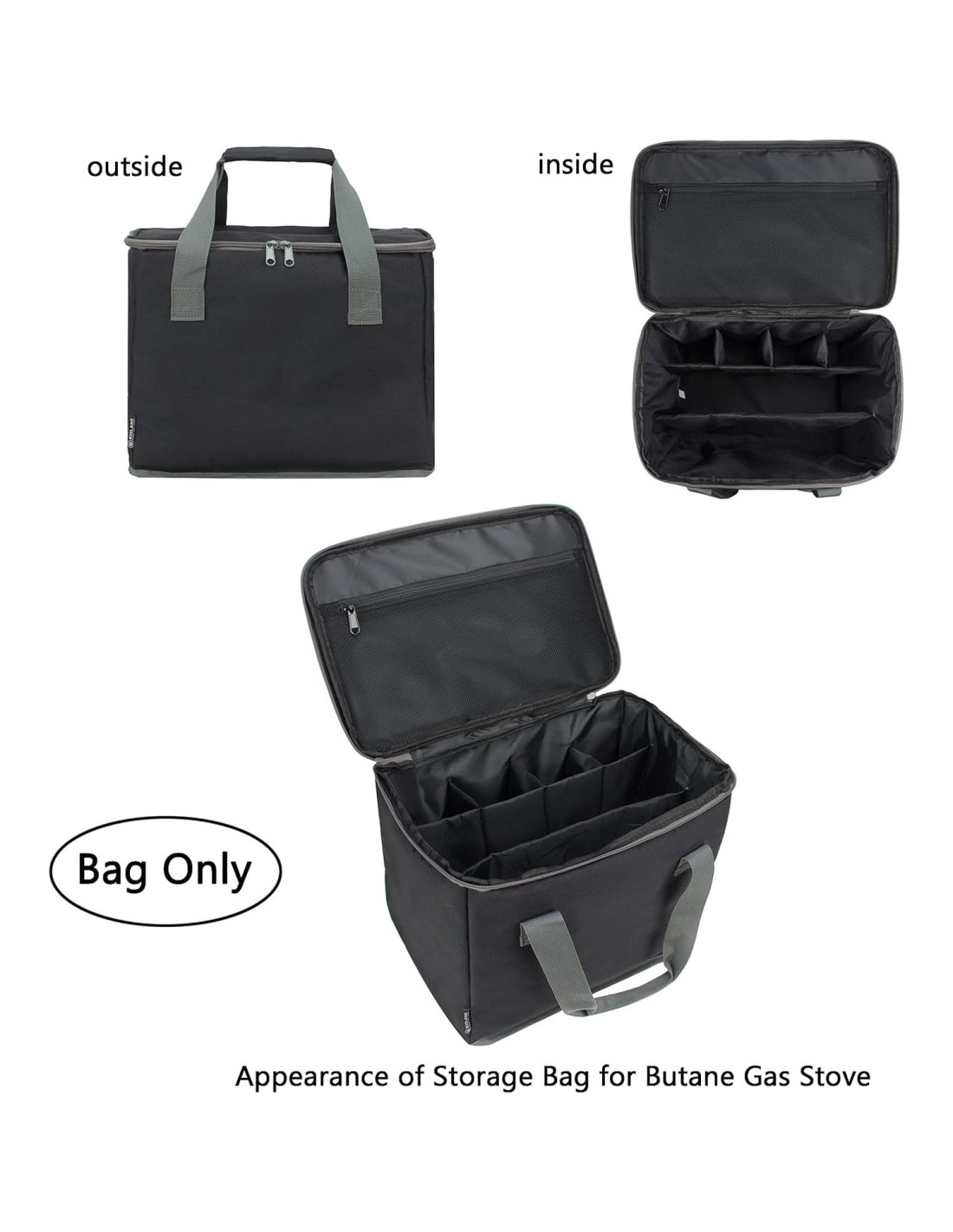 - Fácil de usar: El interior de la bolsa de almacenamiento está dividido en 2 compartimentos espaciosos y 4 ranuras pequeñas, que almacenan la estufa de gas butano portátil, cartuchos de combustible, utensilios de mesa, de manera clara y organizada.