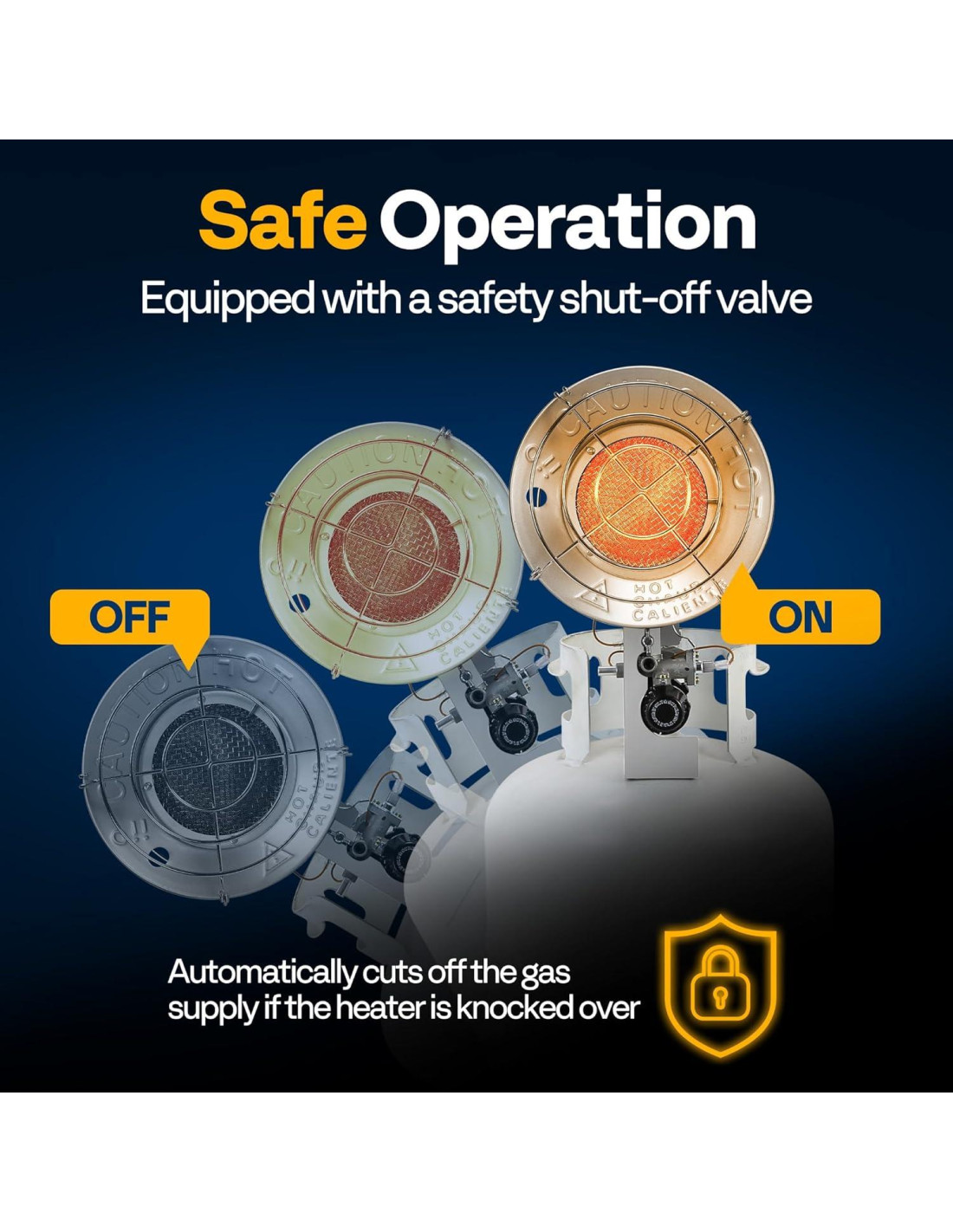 - OPERACIÓN EFICAZ: La cabeza del quemador de 360 grados asegura que el calor se distribuya uniformemente en un área de 44.9 metros cuadrados; El calentador está equipado con una válvula de apagado de seguridad, que corta automáticamente el suministro de gas si el calentador se cae, asegurando un uso seguro; El escudo reflector enfoca la salida de calor, reduciendo el desperdicio innecesario y maximizando la eficiencia energética general de la unidad