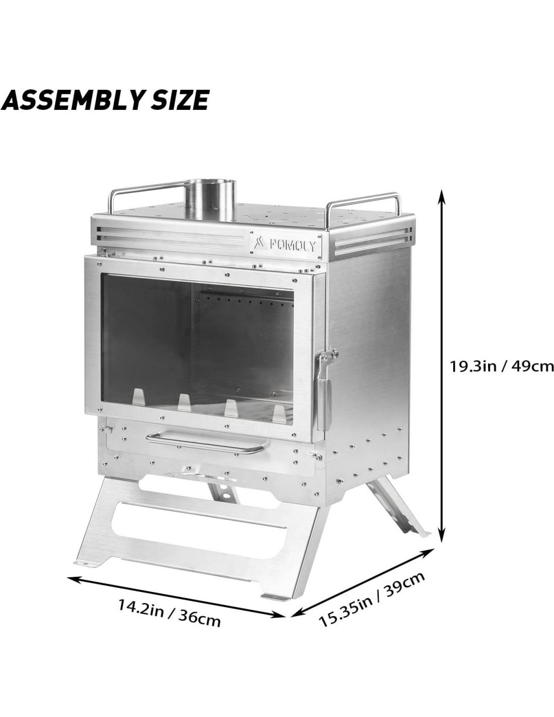 En comparación con el Dweller, el Dweller Max tiene un aumento del 59% en volumen y el diámetro de la chimenea ha aumentado de 2.36in(6cm) a 2.76in(7cm). Hay cuatro agujeros en las patas de la estufa de la tienda para conectar el Dweller Max al RV, y solo se necesitan cuatro tornillos para asegurarla. Además, rediseñamos la chimenea e instalamos la nueva chimenea al revés para evitar que el creosoto se filtre a través de la chimenea durante la combustión. La chimenea con amortiguador recién añadida controla el escape, lo que a su vez controla la tasa a la que la estufa quema, y cuando ajustamos la válvula para reducir la tasa de fuego, el Dweller Max puede seguir ardiendo más tiempo por la noche. El enorme vidrio a prueba de fuego combinado con la cortina de aire de la puerta frontal puede hacer que la llama salte más, y la entrada de aire secundaria en el interior puede hacer que la leña se queme más completamente. Además de tiendas y RVs, el Dweller Max también se puede usar en muchos lugares, como: cabañas en el bosque, campamentos, garajes subterráneos, etc. En comparación con el Dweller Mini, la capacidad de leña ha aumentado en un 172%. En comparación con el Dweller, la capacidad de leña ha aumentado en un 59%. (Dweller Mini 9.3L / Dweller 15L / Dweller Max 25.3L)