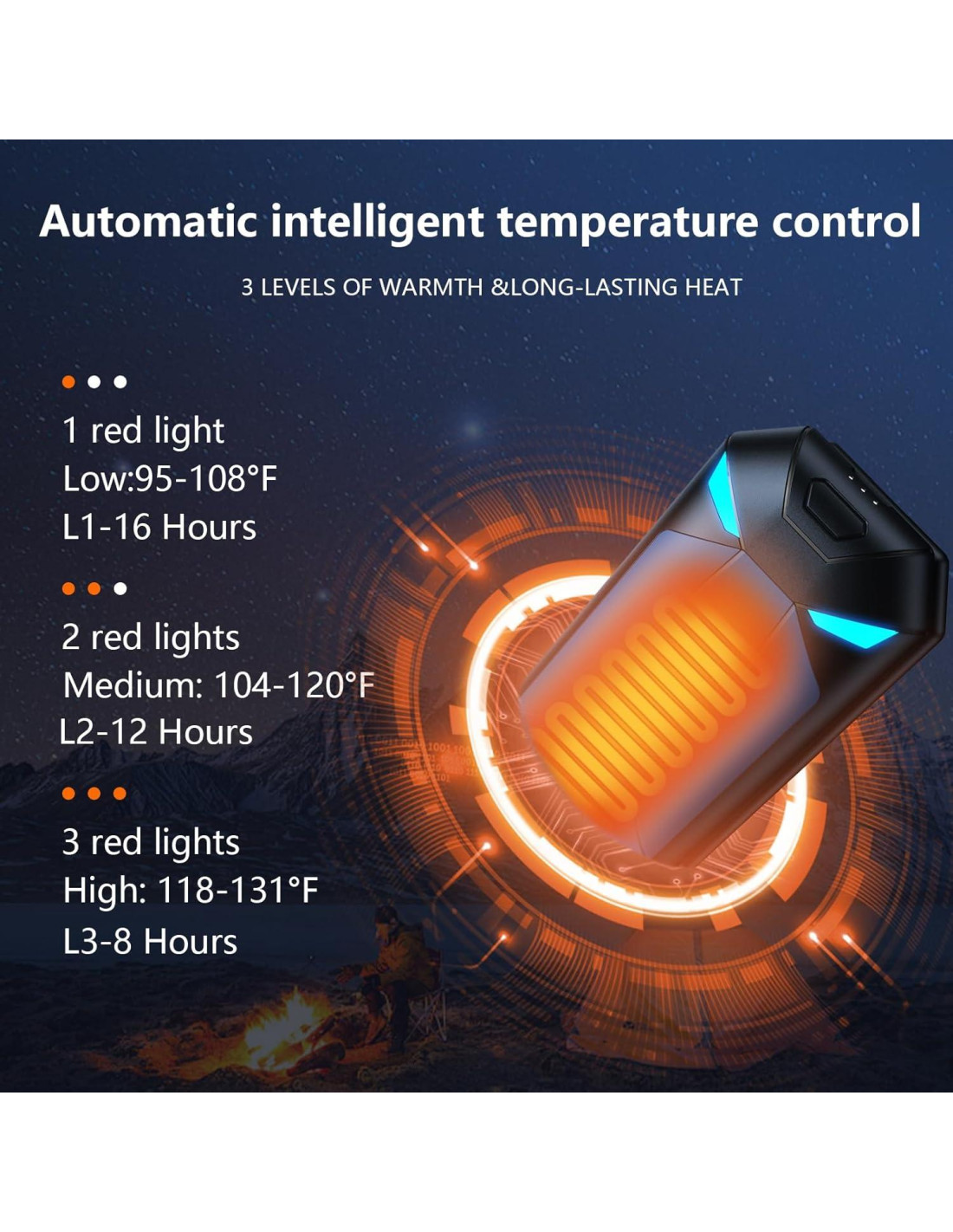- [Calor Instantáneo de 2s & 3 Niveles de Calor] El calentador de manos eléctrico utiliza un sistema de control de chip inteligente. Libera calor en solo 2 segundos y opera a temperaturas de hasta 131F (55C), en un instante manos calientes y bolsillos calientes, con 3 niveles de temperatura ajustable que puedes visualizar desde 3 luces indicadoras. Confort Preciso y Estable. Ya sea que te aventures al frío exterior o realices tus actividades diarias, este calentador de manos reutilizable es el compañero perfecto!