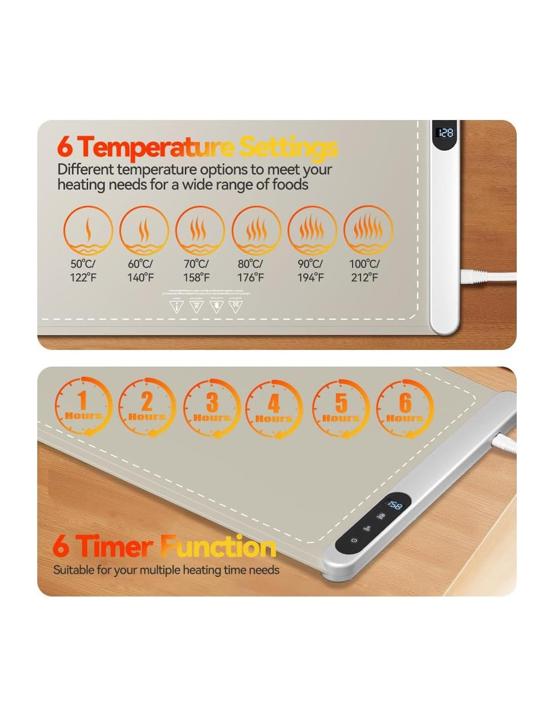 - 6 Configuraciones de Temperatura y Temporizador de 6 Horas: Esto tiene 6 niveles de configuraciones de temperatura (122F/50C - 212F/100C), te ayuda a ajustar la temperatura según sea necesario, permitiéndote controlar con precisión el nivel de calentamiento de tu comida. También cuenta con una función de temporizador inteligente de 1 a 6 horas, que te permite configurarlo según la duración de calentamiento deseada para prevenir el sobrecalentamiento y ahorrar energía.