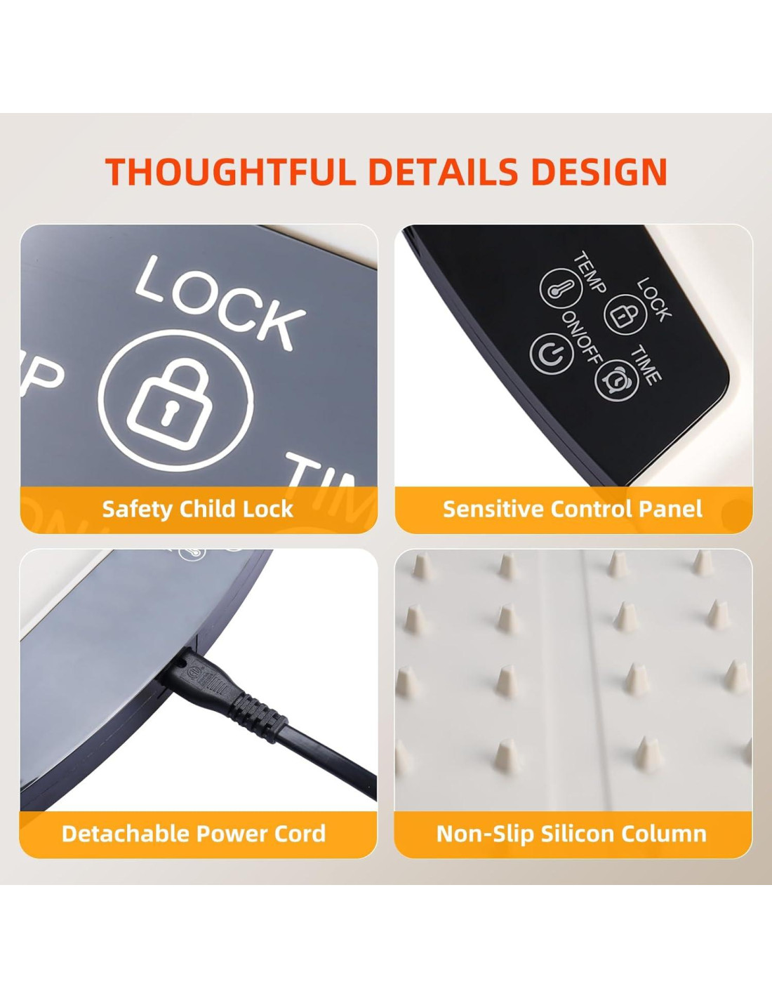 - [Características de Seguridad Pensadas] La almohadilla calentadora de alimentos portátil está equipada con una función de bloqueo para niños que bloquea la configuración para prevenir cambios o apagados accidentales durante su uso, asegurando que tu comida se mantenga caliente sin interrupciones. El mecanismo de bloqueo seguro y las columnas de silicona antideslizantes mantienen tus platos estables y seguros, dándote tranquilidad, especialmente durante reuniones concurridas.