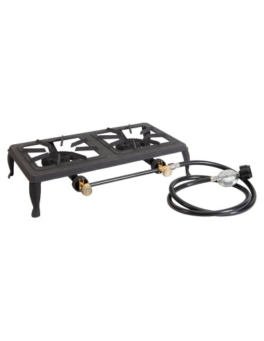 - La estufa de hierro fundido de doble quemador es ideal para cocinar esas comidas especiales al aire libre. Sus características incluyen 2 quemadores de alta potencia de 15000 B.T.U. para un total de 30000 B.T.U. Cuenta con válvulas de bronce y un marco de hierro fundido resistente que está recubierto en polvo y pintado para una durabilidad prolongada. Manguera y regulador necesarios para su funcionamiento, se venden por separado.