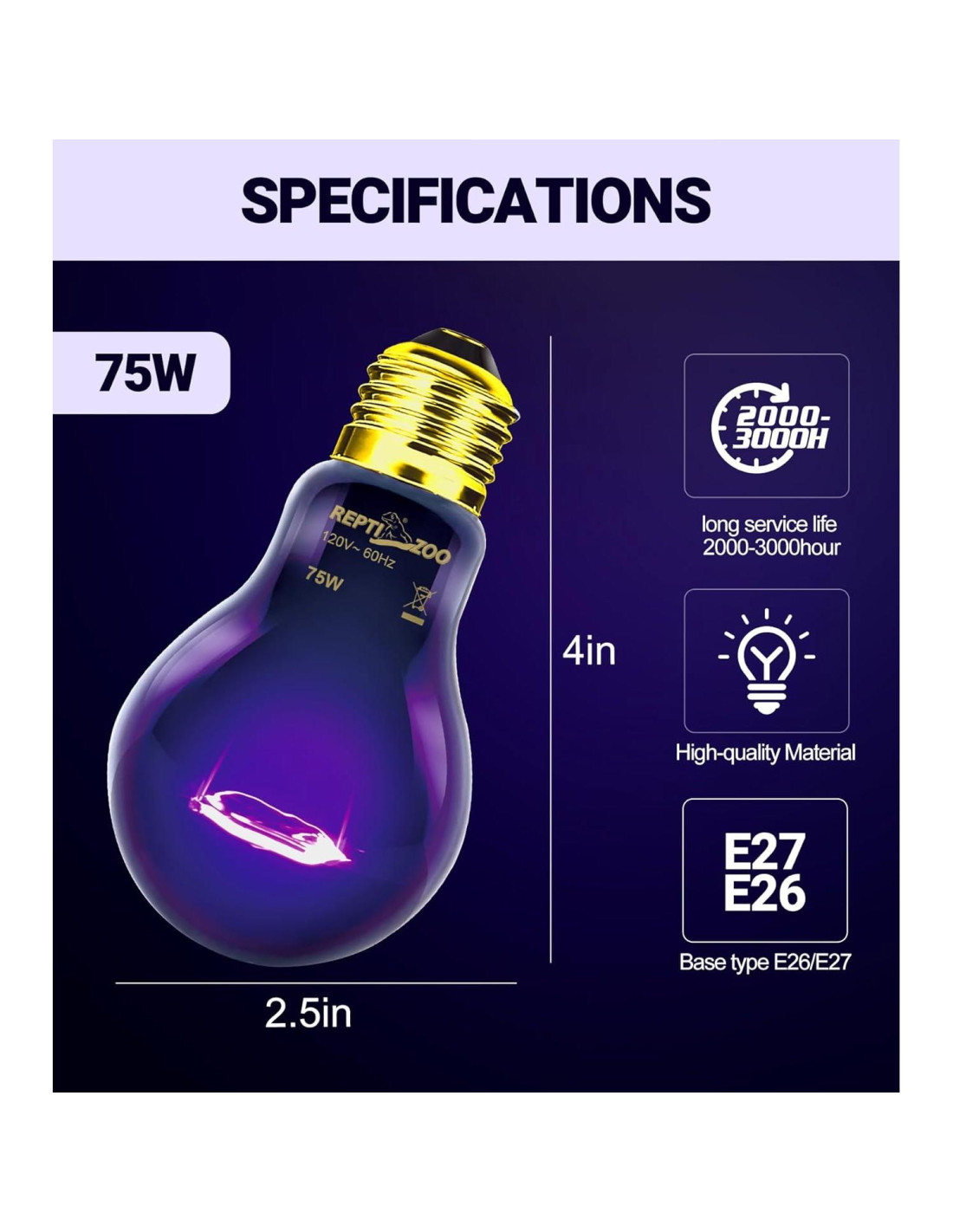 - Tecnología Mejorada: Nuestra bombilla de calor nocturna para reptiles de 75W utiliza tecnología avanzada, asegurando calidad superior y una vida útil de hasta 2000-3000 horas.
