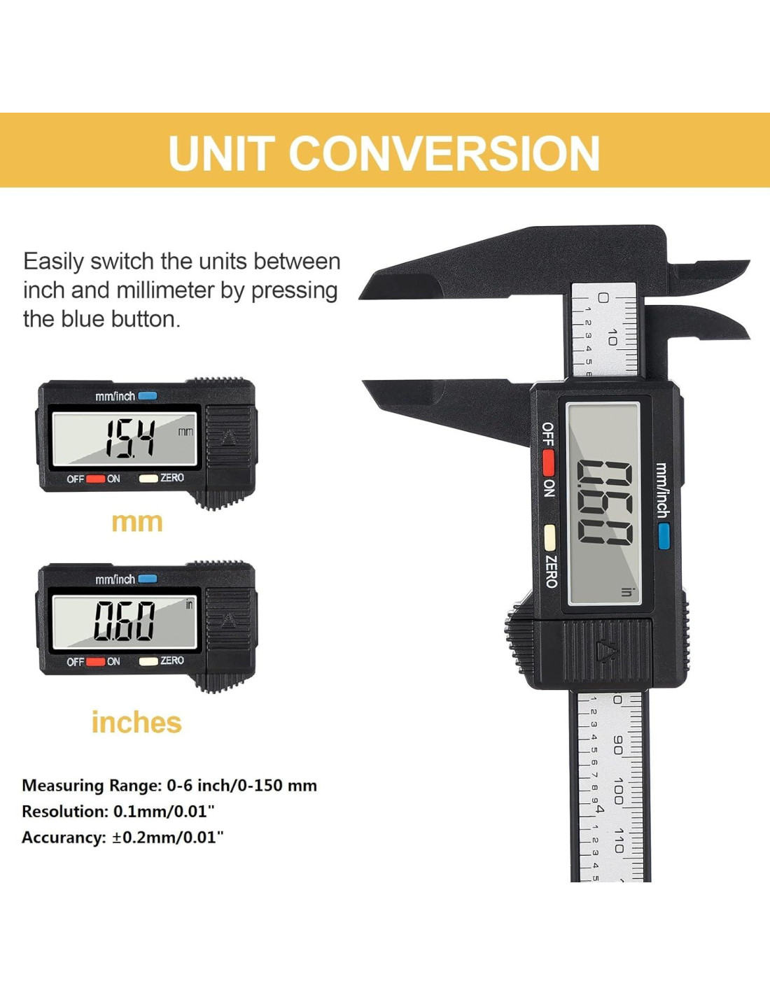 - MEDICIÓN PRECISA: Rango de medición: 0 - 15.24 cm / 0 - 150 mm; Resolución: 0.0254 cm / 0.1 mm; Precisión: +/-0.2 mm/0.01 in. Herramienta de medición digital perfecta y precisa para mediciones de hogar/DIY, etc. Por favor nota que no es para uso profesional de precisión extrema de grado técnico