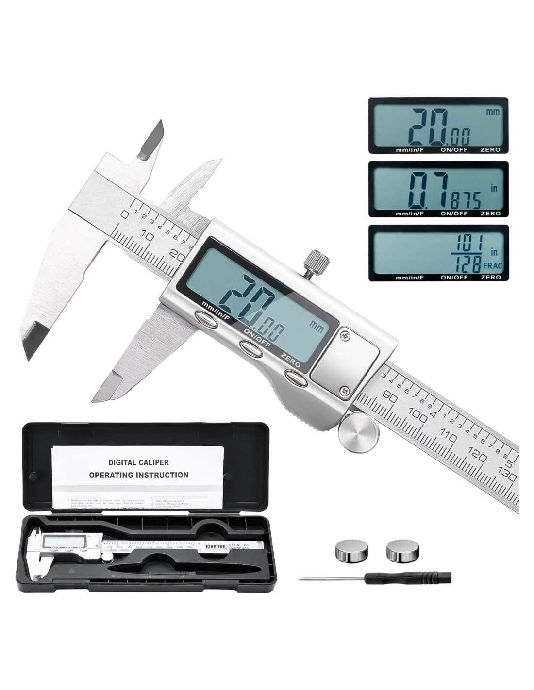 Herramienta de Medición de Calibrador Digital, Calibrador Vernier de 6 Pulgadas Micrómetro Digital con Pantalla LCD Extra Grande, Cambio Fácil de Pulgadas a Métrico Fracción, Herramienta de Medición de Acero Inoxidable para DIY/Impresión 3D