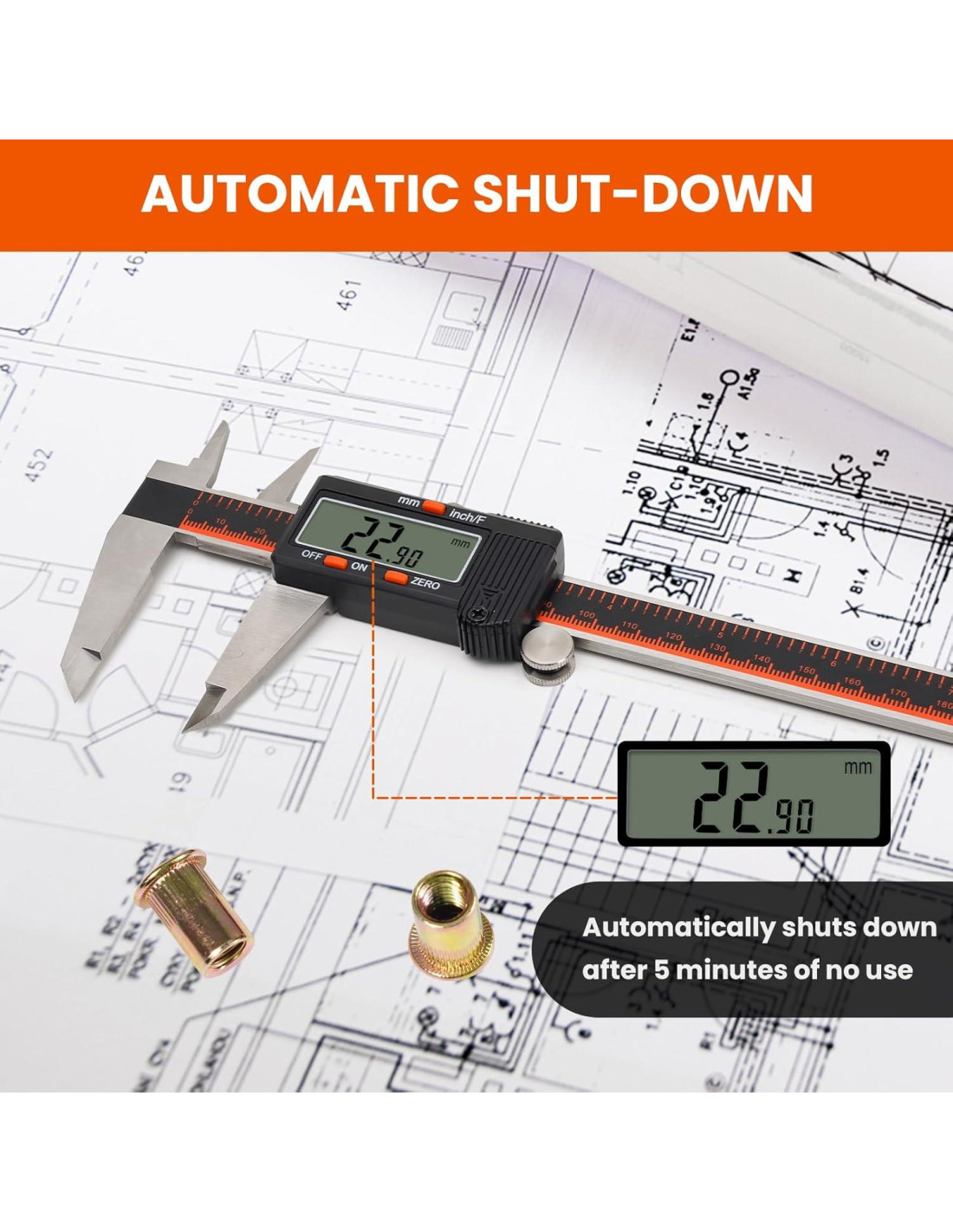 - [PANTALLA LCD GRANDE]-El calibre digital de 20.32 cm está equipado con una pantalla LCD grande y fácil de leer. La gran pantalla LCD ayuda a las personas a obtener resultados precisos rápida y fácilmente. Incluso las personas mayores pueden leerlo fácilmente. También es fácil de usar y leer incluso a la luz del sol brillante. El calibrador vernier se apaga automáticamente después de 5 minutos de no uso para ahorrar energía