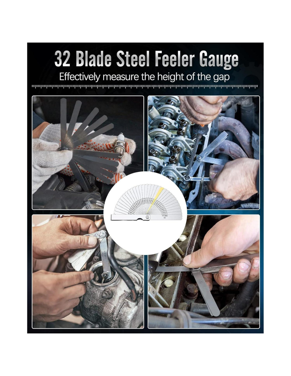 - [4 Mediciones & Precisión & Calibrador de Sensibilidad] Con dos juegos de mandíbulas y una sonda, este calibrador se puede usar para medir diámetro externo e interno, profundidad y escalón. La lectura de la medición es estable y no temblorosa. Calibrador de sensibilidad de acero de 32 hojas adecuado para diseñadores, ingenieros, mecánicos para medir el grosor de los espacios de válvulas, espacios de bujías, espacios de anillos de pistón y otros lugares de difícil acceso.