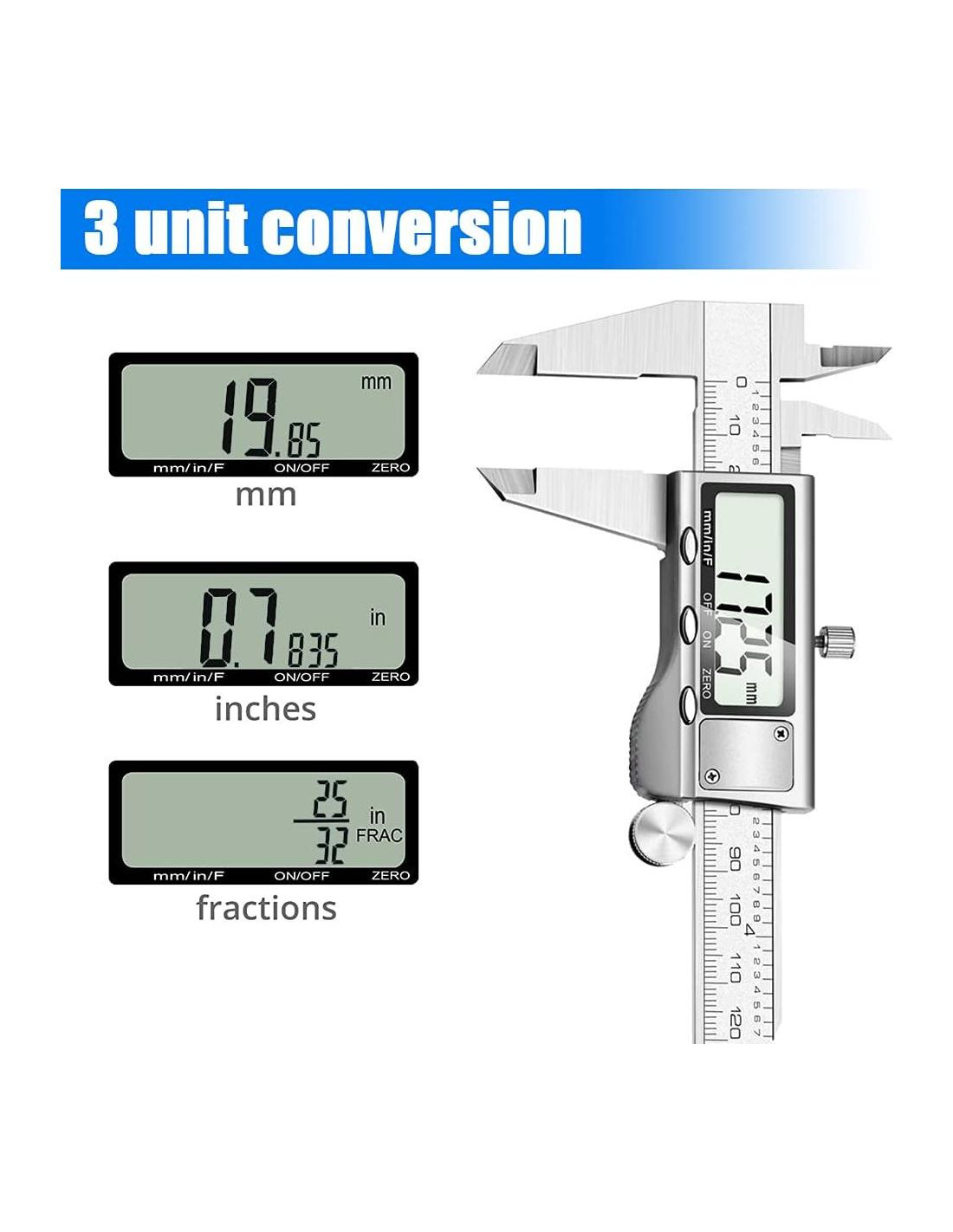 - [CONVERSIÓN DE UNIDADES Y PANTALLA LCD MÁS GRANDE] Estos Calibradores Digitales tienen un botón de una tecla para cambiar rápidamente entre pulgadas (pulg), fracciones (F), milímetros (mm). El calibrador digital de 6" tiene una pantalla LCD grande y fácil de leer que es fácil de usar y leer incluso bajo luz solar intensa. Se apagará automáticamente después de 5 minutos de no uso para ahorrar energía.
