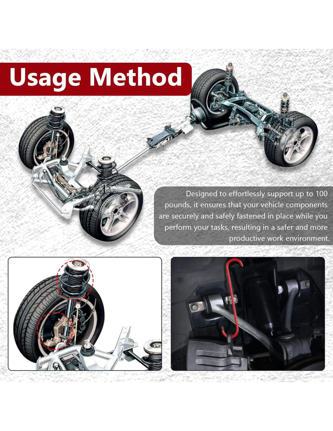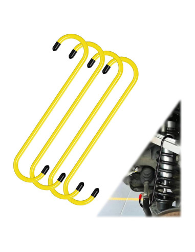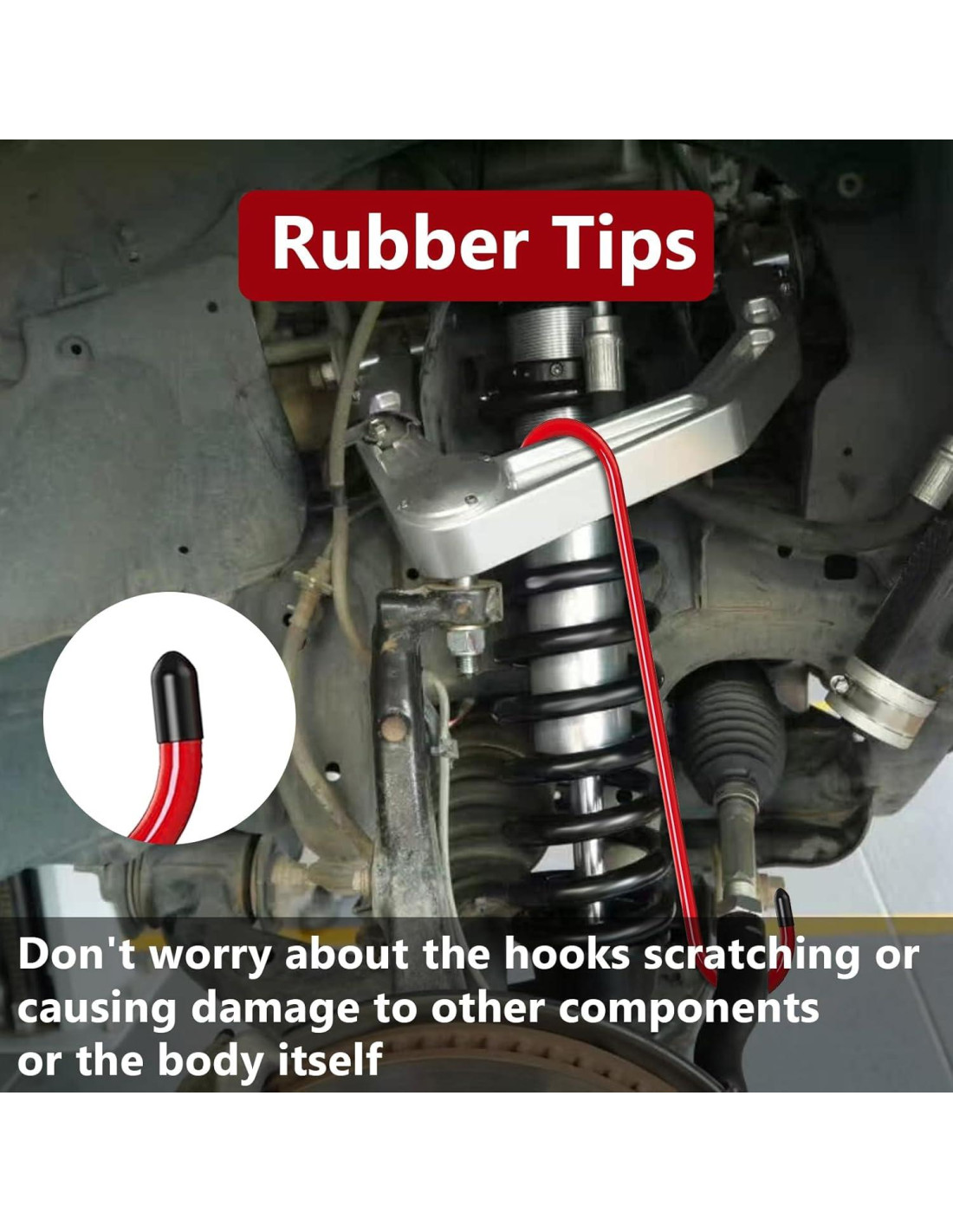 - Puntas de goma: Las puntas de goma en ambos extremos previenen el rayado o daño a sus componentes de suspensión o carrocería, permitiéndole usarlo sin pinchar accidentalmente la manguera de freno. No hay necesidad de preocuparse por los ganchos que rayan o causan daño a otras partes o a la carrocería misma.