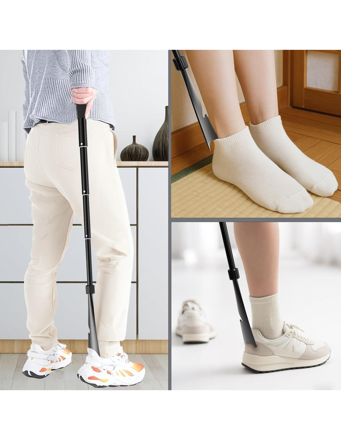 - Longitud Ajustable Telescópica - Ideal como Calzador de Mango Largo para Personas Mayores - Gira para desbloquear, extiende o retrae entre 16.9" (42.9 cm) y 37.4" (95.2 cm), luego gira para bloquear de forma segura. Como un calzador largo para personas mayores, proporciona un alcance adicional para que los usuarios con movilidad limitada, usuarios embarazadas o personas mayores puedan ponerse zapatos o botas sin doblarse. Este calzador de mango largo ajustable se adapta a diferentes alturas y escenarios, ya sea sentado o de pie.