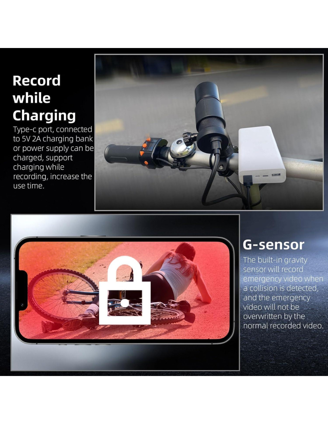 - [Cámara HD 1080P a Prueba de Agua] : La cámara de bicicleta ofrece una resolución de 1080P y un gran ángulo de 150. La calidad de imagen resultante es excepcionalmente buena y cristalina. La función de visión nocturna Starlight asegura que la cámara pueda grabar detalles claros incluso por la noche. Con un diseño a prueba de agua, puedes llevarla al aire libre sin preocupaciones incluso en días de lluvia.