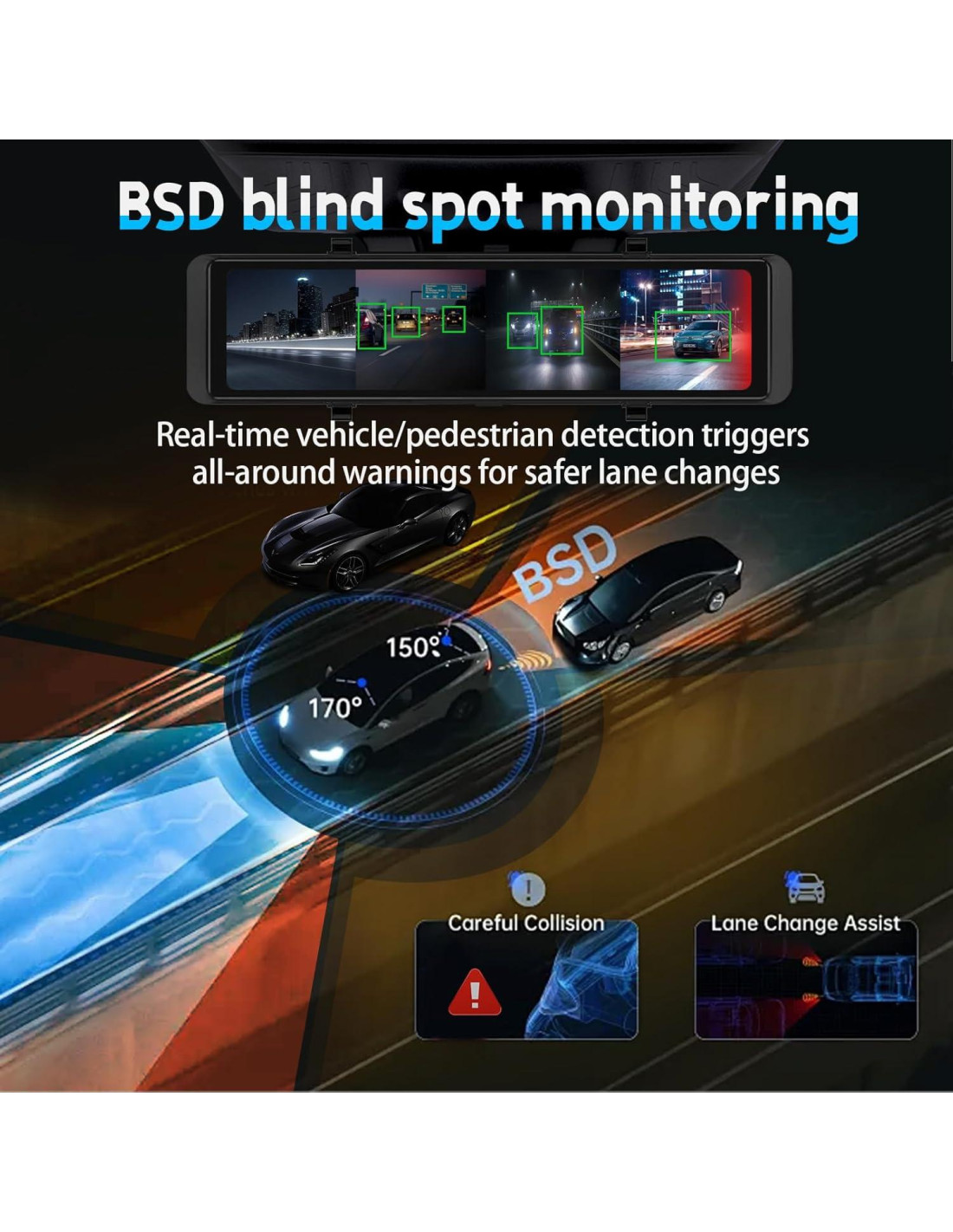 - Características especiales: Pantalla de 30.48 cm, grabador de conducción de espejo retrovisor de 4 canales, cámara frontal de resolución 2K y 3 cámaras de 1080P trasera/izquierda/derecha, monitoreo de estacionamiento, línea de asistencia de reversa, espejo retrovisor de transmisión, lente impermeable