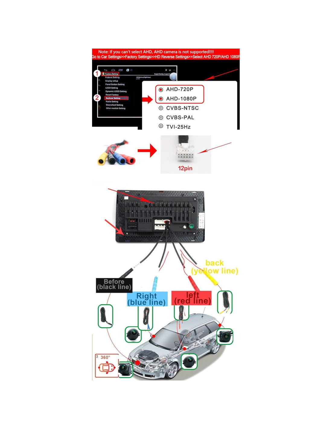 - IMPORTANTE: Si has seguido el mismo método de conexión de todo a tu radio de coche equipada con Android, pero ninguna aplicación puede ver la cámara, verifica si alguna de las siguientes dos cosas está presente: '1. Primero verifica si el coche admite la descarga de la aplicación 360. 2. ¿Es una pantalla Android, que debe usarse con la aplicación 360 para poder utilizarla? Por favor, verifica si tu coche admite la descarga de la aplicación 360 antes de comprar.