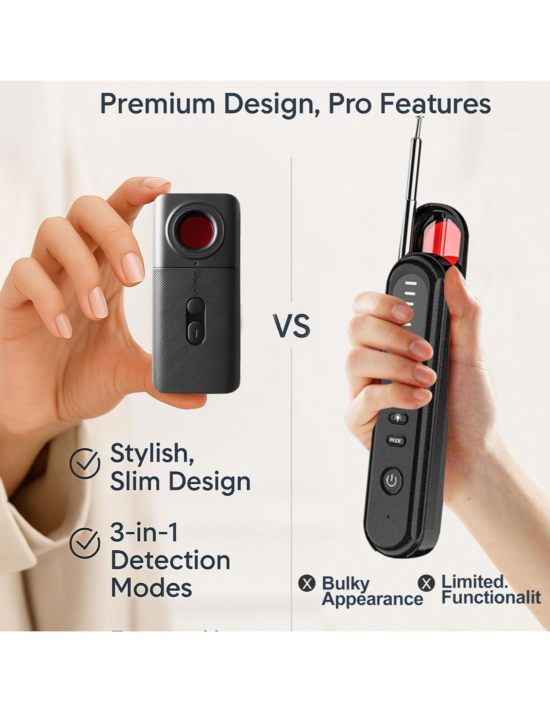 - La privacidad nunca debería ser un lujo. Por eso este detector de cámaras delgado cabe fácilmente en tu bolso. Es ligero, confiable y siempre está listo - porque tu seguridad debería viajar contigo.