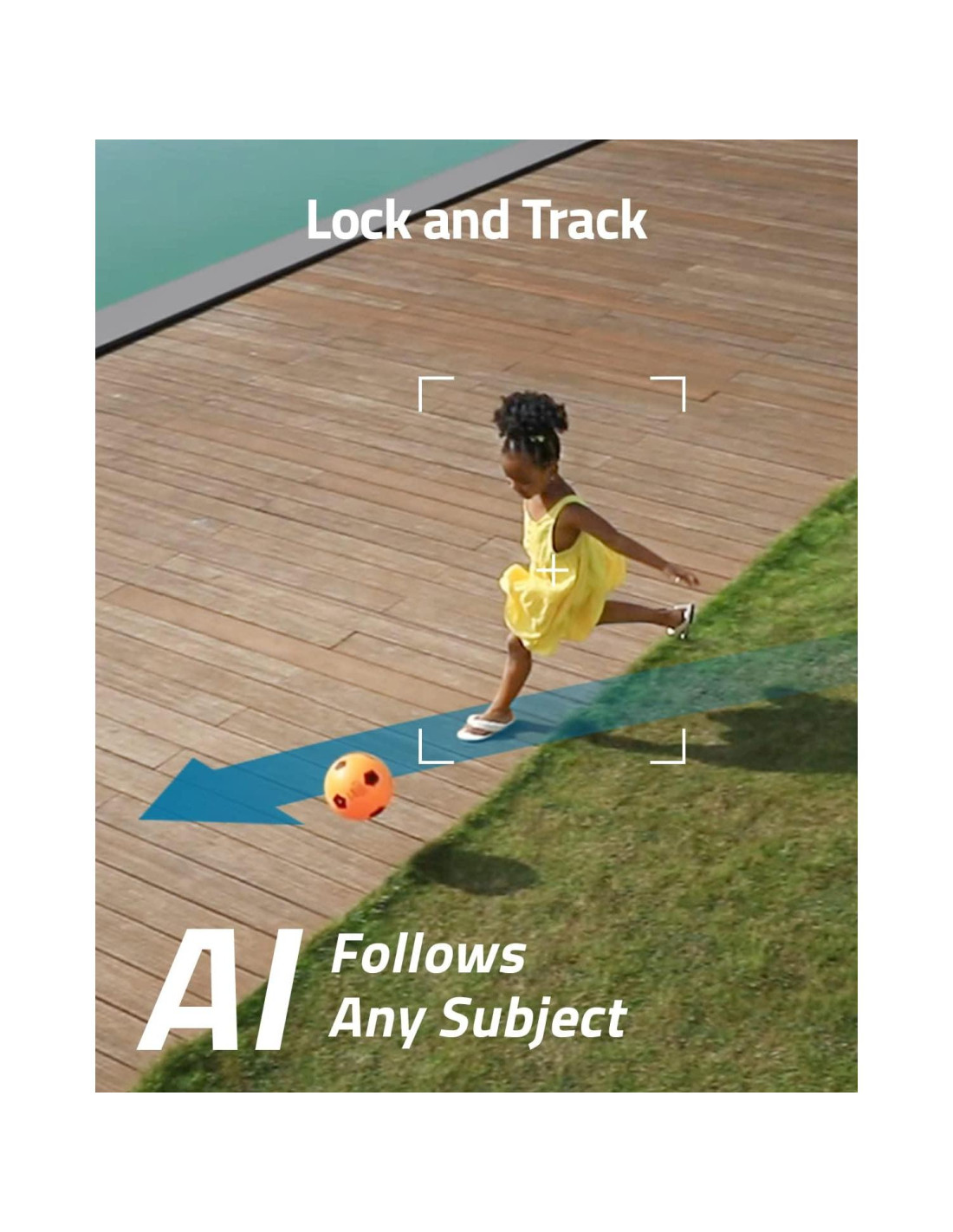 - Bloqueo y seguimiento de sujeto con IA: La IA en el dispositivo reconoce cuando una persona está presente y luego bloquea, rastrea y graba al sujeto.