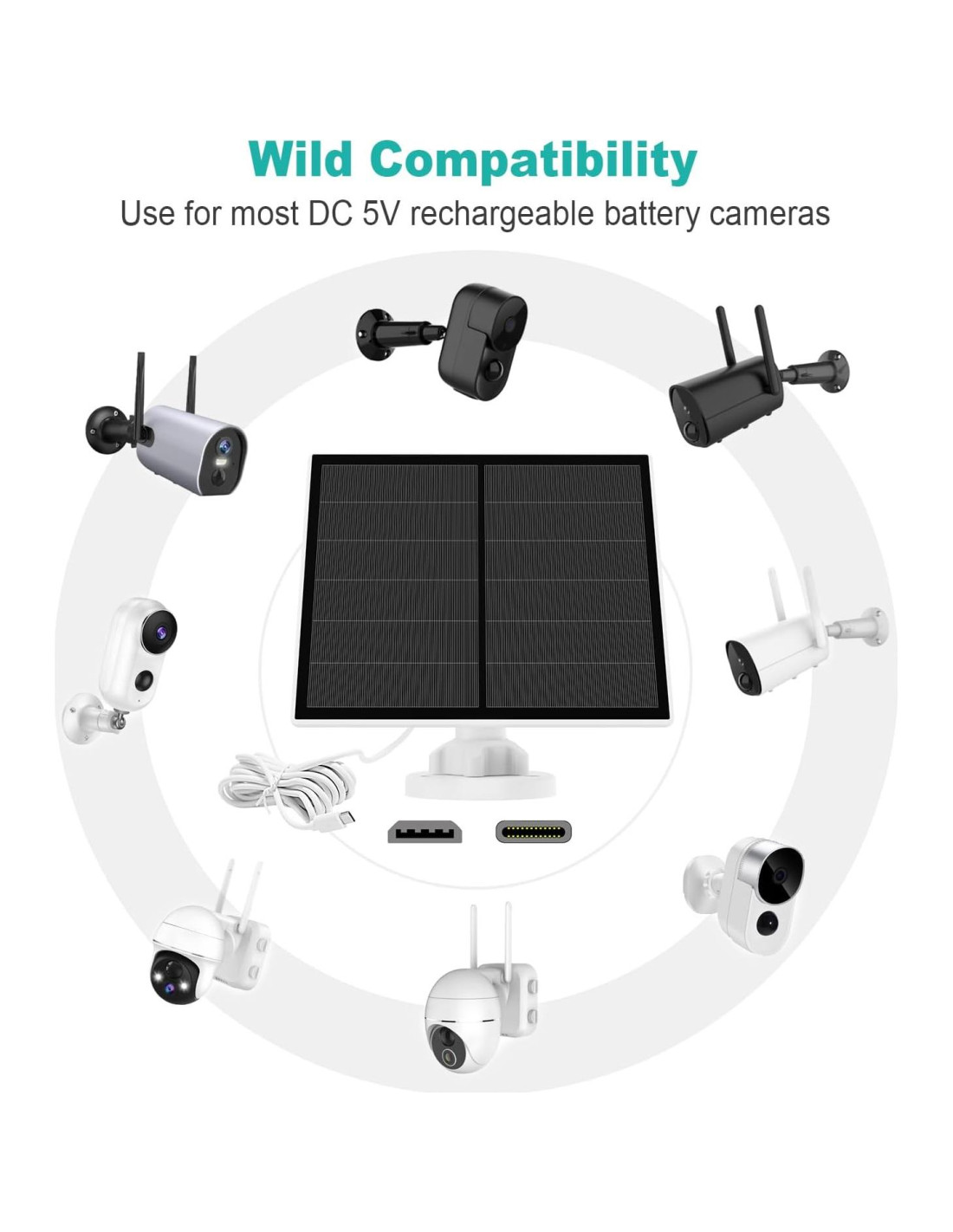 - Compatibilidad: El panel solar de 5W está diseñado para cámaras de seguridad con batería recargable que tienen puerto micro USB o USB-C. El panel solar no es compatible con cámaras Arlo, Blink, Ring, Eufy, Google Nest, Kasa y cualquier cámara conectada sin batería.