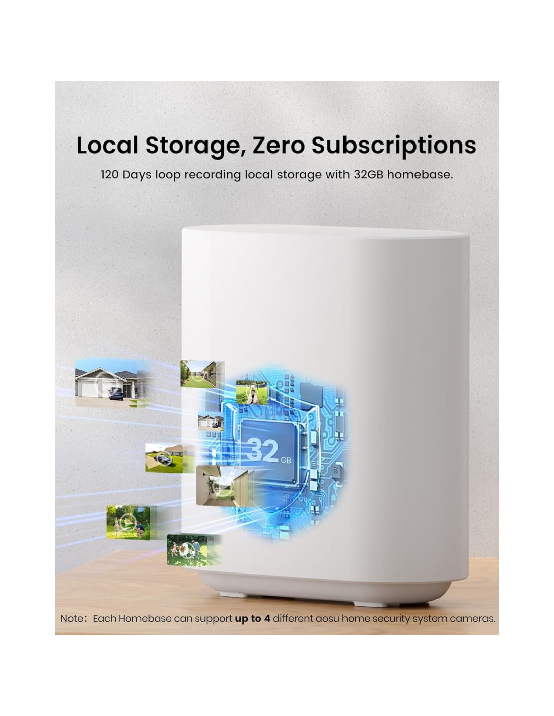 - Nota: Cada base de hogar soporta un máximo de 4 cámaras de seguridad AOSU.