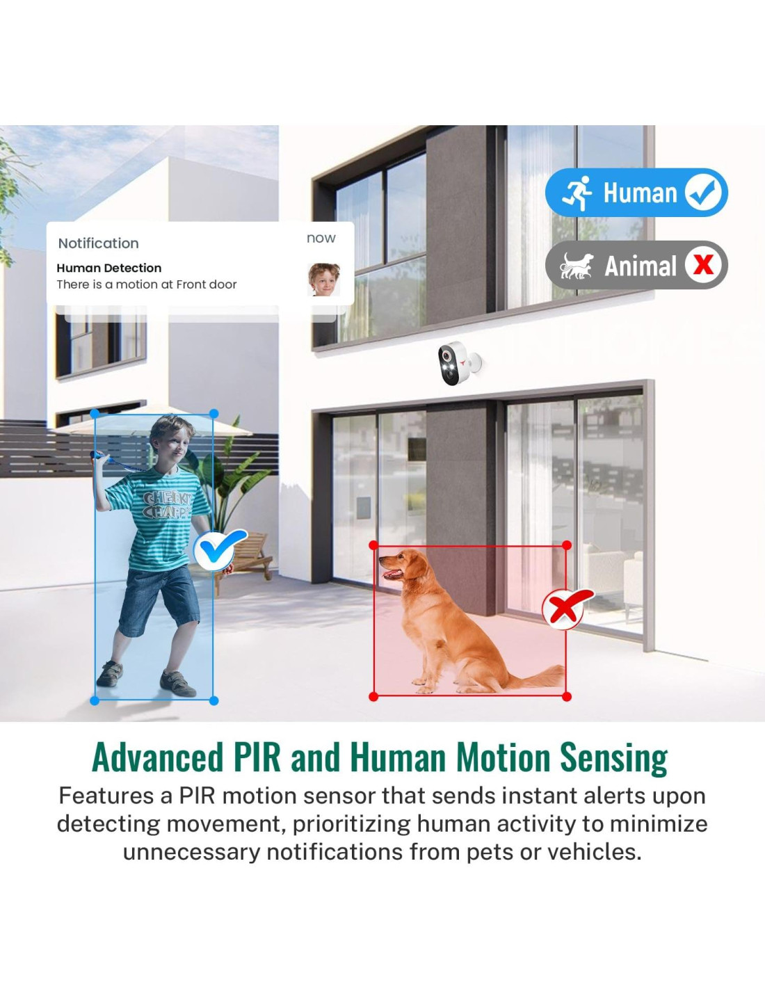 - Detección de Humanos Inteligente para Alertas Relevantes: No más falsas alarmas. La IA se enfoca en humanos, filtrando mascotas y coches que pasan.