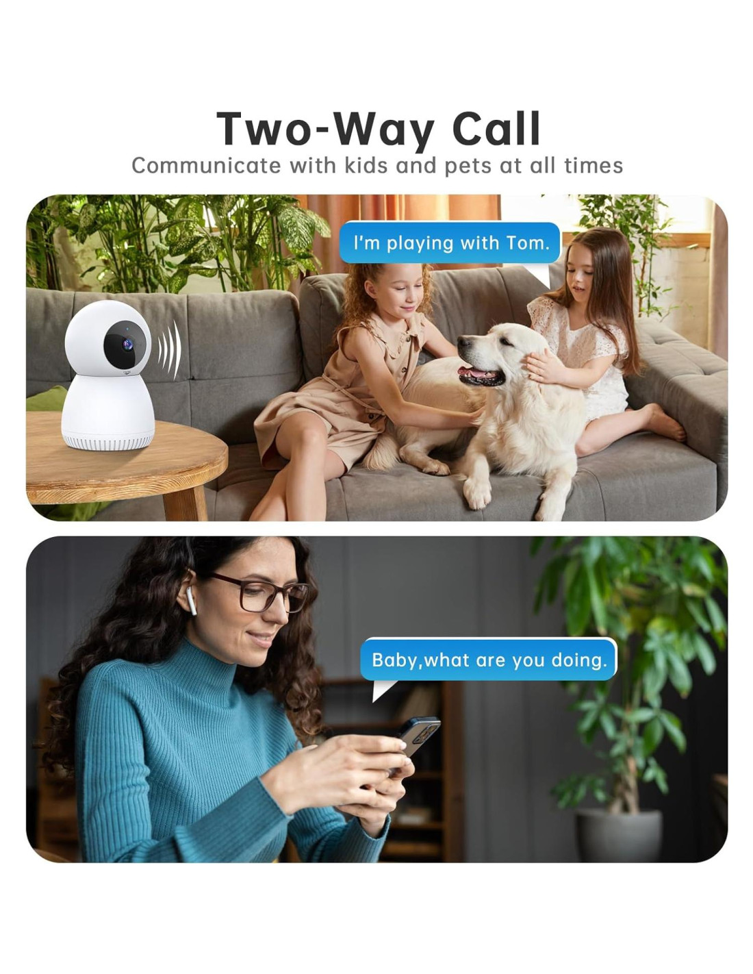 - Visión Nocturna IR y Llamada Bidireccional, cámara inalámbrica interior viene con 4 luces infrarrojas y muestra hasta 33 pies (10 metros) en la noche. Incluso en entornos poco iluminados, la cámara interior inalámbrica obtiene video HD claro para que no te pierdas ningún momento. La cámara de seguridad interior inalámbrica utiliza un micrófono y altavoz integrados para soportar llamadas verbales en tiempo real bidireccionales para una comunicación cara a cara sin complicaciones con tu familia.