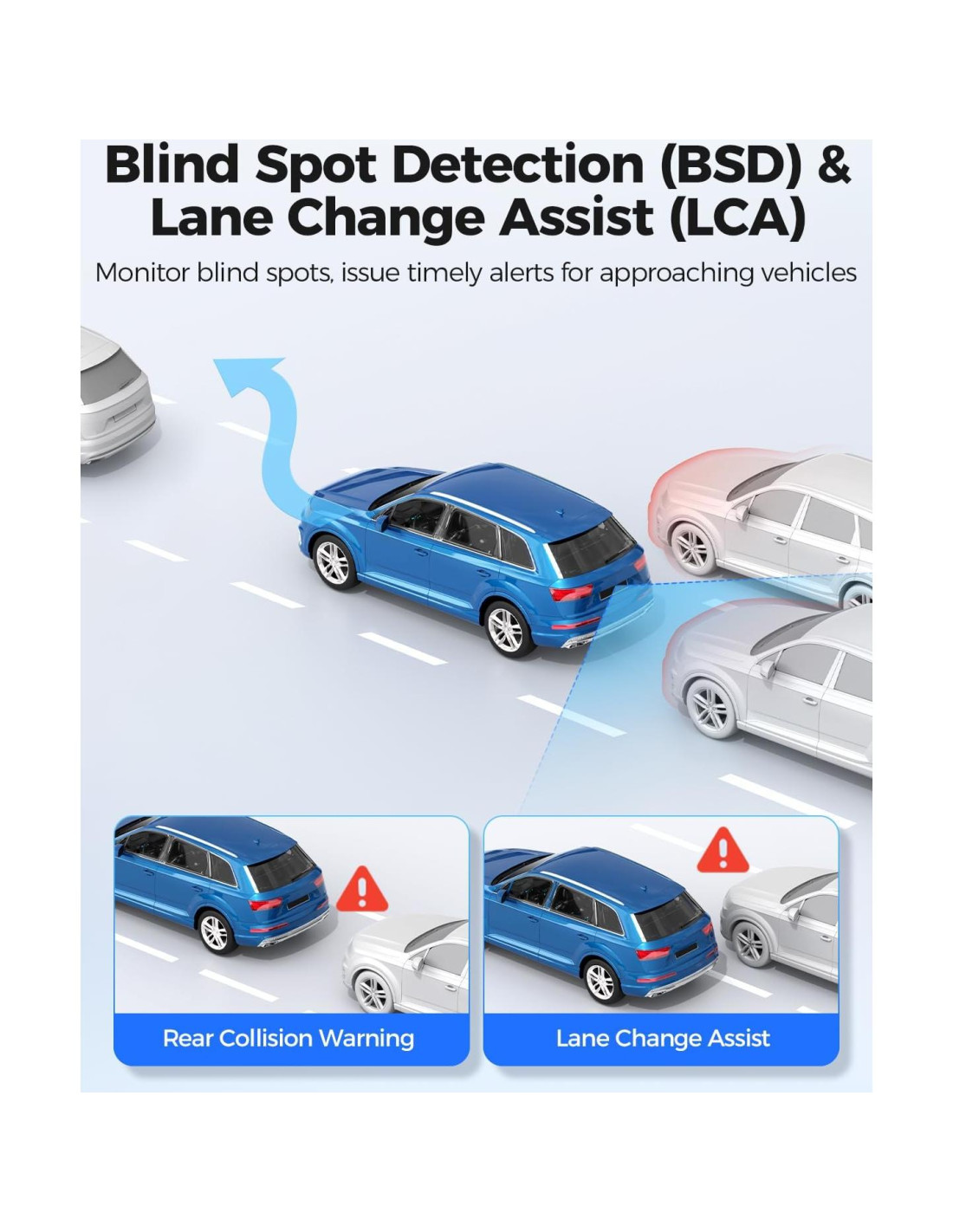 - [BSD y LCA Mejorados] Monitorea los puntos ciegos en los lados y la parte trasera del vehículo, alertándote sobre posibles riesgos de colisión trasera y mejorando tu seguridad al cambiar de carril. La cámara de espejo retrovisor PG17 Max proporciona protección integral en la carretera