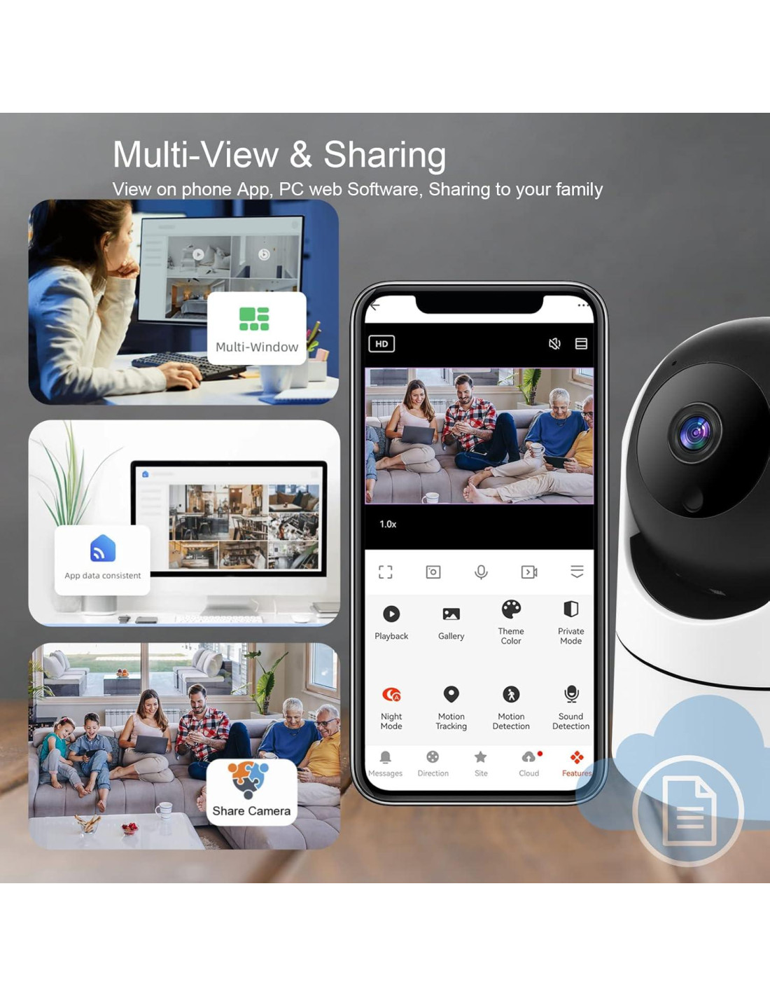 Hasta 12 metros de visión nocturna, podemos ver en vivo incluso en entornos con poca luz. En la aplicación podemos activar, desactivar o cambiar automáticamente el LED IR. La resolución de la cámara es de hasta 2K, puedes ver videos e imágenes más claras. Con panorámica/tilt, zoom digital 6X, puede ver más detalles en tu aplicación móvil. Notifica el sonido alrededor de la cámara, el llanto del bebé o niveles de ruido excesivos, la cámara de seguridad te alertará en tu teléfono. Cuando se detecta movimiento, esta cámara de seguridad enviará rápidamente las notificaciones de alerta a tu teléfono móvil. En el momento, toma instantáneas y graba video. Personaliza el sitio que deseas ver, hay 6 sitios preestablecidos que se pueden configurar en el teléfono, el sitio que deseas ver, puedes llamar al número del sitio. La cámara wifi tiene micrófono y altavoz integrados, permite una conversación clara y fluida. Habla en tiempo real con cualquier persona en cualquier momento donde estés. Los videos se pueden almacenar en una tarjeta micro SD (hasta 128GB, no incluida) o subir a un servidor en la nube. La cámara también puede conectarse a almacenamiento NVR en disco duro. La cámara de monitor de bebé se puede ver en teléfono móvil, PC Web y Monitor NVR. Y se puede compartir con tus amigos para que vean al mismo tiempo.