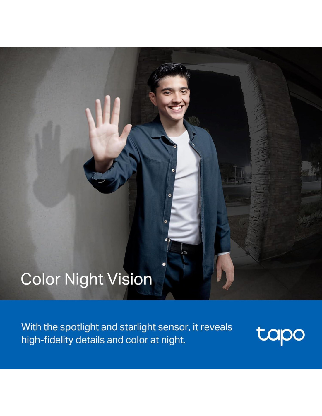 - [Vista en vivo 2K+/5MP] Siempre sepa lo que sucede frente a su puerta a través de la aplicación Tapo. Con el sensor de luz estelar y la resolución de 2K 5MP, verifique todos los detalles finos capturados incluso en entornos con poca luz.