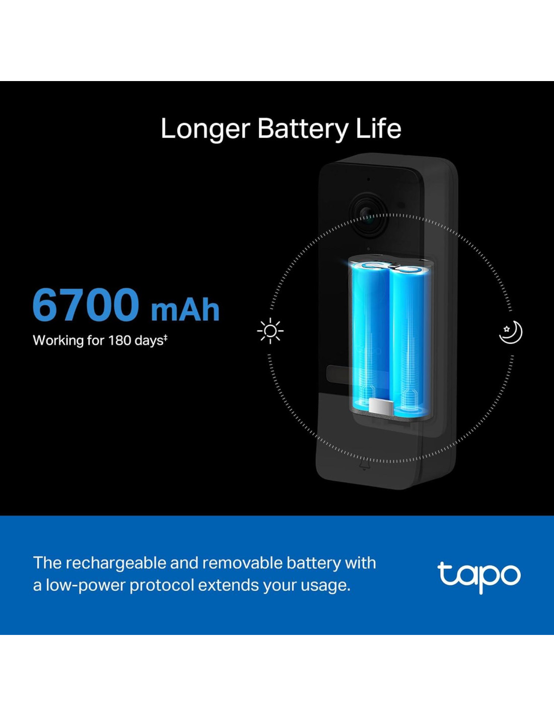 Siempre sepa lo que sucede frente a su puerta con Tapo D230S1, el único timbre de video inteligente que necesita para su hogar. La clara y nítida resolución de 2K 5MP de la cámara del timbre verifica todos los detalles finos capturados incluso en entornos con poca luz. Con el foco integrado y el sensor de luz estelar, Tapo D230S1 revela detalles y colores de alta fidelidad por la noche. Con el FOV ultra amplio de la cámara (160 Diagonal), la vista en vivo 4:3 de Tapo asegura que los usuarios puedan verificar a los visitantes de pies a cabeza a tan solo 1 m, lo que muestra más detalles verticales que otros timbres de 16:9. La batería recargable y extraíble con un protocolo de bajo consumo extiende su uso hasta 180 días. Los algoritmos de IA inteligentes identifican personas y automóviles, y notifican a los usuarios según sea necesario. Con audio bidireccional o una respuesta rápida grabada, comuníquese directamente con sus entregas a través de la aplicación Tapo. Guarde videos grabados en la tarjeta microSD instalada en el hub (hasta 512 GB) o utilizando los servicios de almacenamiento en la nube Tapo Care. Reciba alertas cuando alguien intente quitar el timbre con la función de alarma antirrobo. El Tapo D230S1 funciona bien en días lluviosos y en entornos húmedos con su característica de resistencia al agua y al polvo IP64.