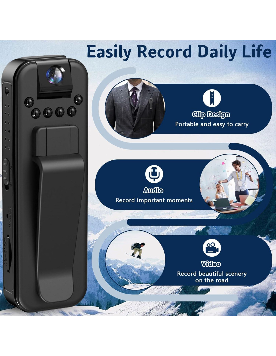- [Cámara Corporal Multifuncional] Esta práctica mini cámara corporal soporta grabación de video, grabación de audio, grabación en bucle y visión nocturna. Después de encender la grabadora de video, solo un clic para activar el modo de grabación requerido. Es muy fácil de usar y adecuada para grabar paisajes de viaje, recolección de evidencia de aplicación de la ley, entrega exprés, reuniones, cursos y seguridad personal al aire libre.