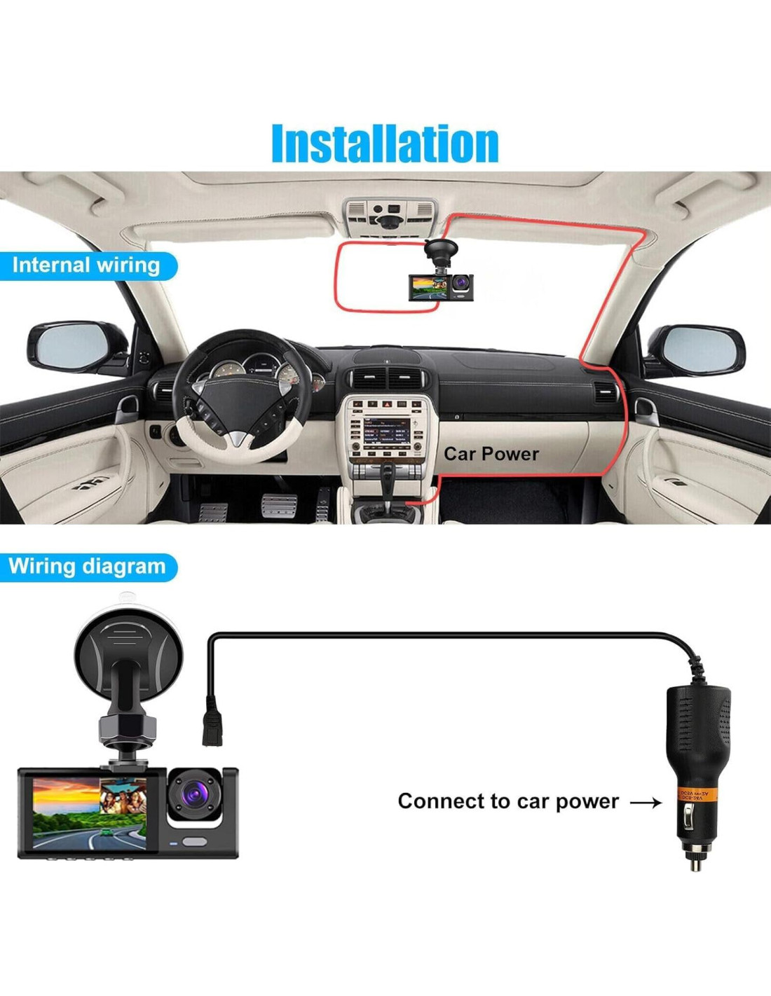 - Múltiples Métodos de Suministro de Energía: El cable de alimentación para encendedor de cigarrillos está incluido en el paquete. Si tu automóvil no tiene puerto de encendedor de cigarrillos, también puedes usar un cable de alimentación USB para encender la cámara de tablero.