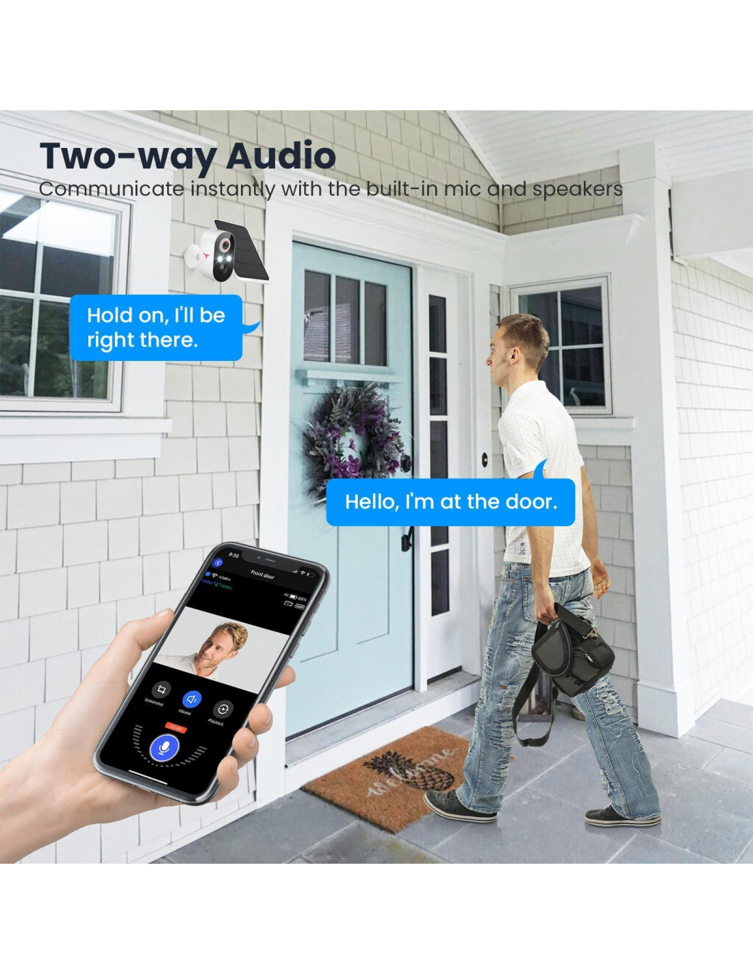 Energía Solar: Equipado con un panel solar de alta eficiencia, esta cámara de seguridad solar para exteriores requiere solo unas pocas horas de luz solar cada día para mantener una protección ininterrumpida durante 365 días. Lente Gran Angular para Supervisión Completa: Monitorea cada rincón de tu entrada con una lente que captura más. Almacenamiento en la Nube Asegurado con Encriptación AES: Mantén tus grabaciones privadas con almacenamiento en la nube encriptado, disponible para acceder en cualquier momento (se vende por separado). Optimizado para Redes Wi-Fi de 2.4GHz: Conexiones confiables aseguran un rendimiento fluido sin interrupciones. Tu timbre conoce la diferencia entre personas y mascotas, por lo que solo las alertas importantes te llegan. Habla con invitados o repartidores en tiempo real desde tu smartphone. Mantén tus grabaciones privadas con almacenamiento en la nube encriptado, disponible para acceder en cualquier momento (se vende por separado). Monitorea cada detalle por la noche con visión a todo color. Ve caras y movimientos tan claramente como en plena luz del día. Q1: ¿Puedo usar mi smartphone para controlar la cámara de seguridad y ver en vivo? A1: Sí, puedes usar la aplicación para ver el video. Q2: ¿Cuál es el rango máximo para que la cámara de seguridad detecte movimiento humano? A2: Puede ver hasta 20 a 25 pies (6.1 a 7.6 metros). Q3: ¿Se pueden respaldar los videos de esta cámara en línea? A3: Guardar videos requiere una suscripción, comenzando con una prueba gratuita. Se renovará automáticamente a menos que canceles durante la prueba. Q4: ¿Mis videos subidos están encriptados en la nube? A4: Sí, los videos en la nube están encriptados de forma segura con AES-128. Q5: ¿Cómo se comporta la cámara en condiciones climáticas extremas? A5: Tiene certificación IP65, es resistente a la intemperie y maneja condiciones como lluvia, sol, clima cálido o frío.