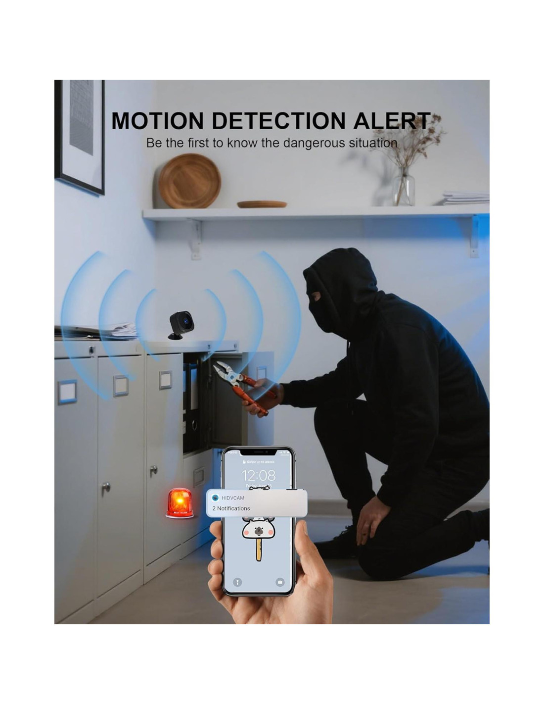 - Alertas de Detección de Movimiento, Rápidas y Precisas, La función de Detección de Movimiento de la cámara mini A12 identifica cambios en una escena comparando diferencias entre cuadros consecutivos, y cuando se detectan suficientes cambios, las cámaras mini para seguridad del hogar comienzan a funcionar y te envían una notificación lo antes posible, asegurando que no te pierdas un momento crítico. Esto significa que no hay necesidad de perder tiempo viendo largos períodos de video inactivo, aumentando así la eficiencia de trabajo de la cámara.