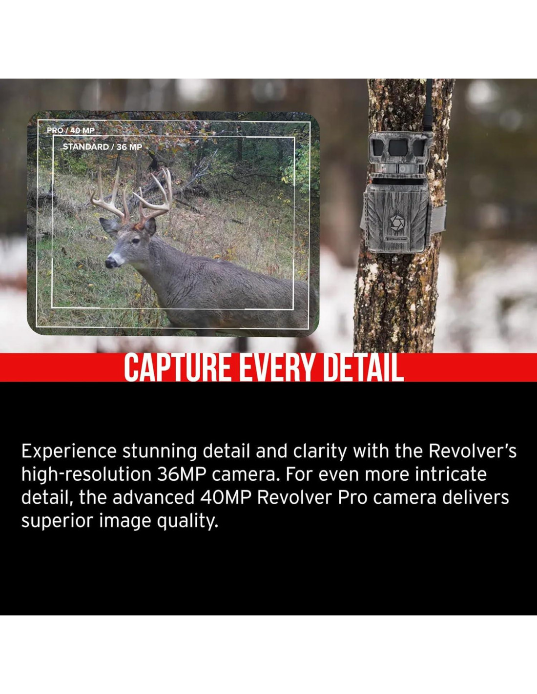 La nueva Cámara de Caza Celular Stealth Cam Revolver 36MP 360 Grados ofrece el equivalente a seis cámaras en un solo dispositivo, capturando fotos de 4MP, 8MP, 16MP y 36MP y video en HD 1080 con audio a través de un revolucionario modelo celular de 360 grados que cubre seis zonas para ofrecer un panorama completo de su entorno. Esto significa que los usuarios obtienen una visibilidad completa de 360 grados, de día y de noche, para asegurarse de que nunca se pierdan nada, incluso ciervos que pasan detrás de donde está posicionada la lente. Además, gracias a su motor silencioso y pivotante, puedes obtener más de una foto desde un solo punto de vista cuando se activa una zona. La cámara responde rápidamente para ofrecer imágenes y videos de alta calidad en tiempo real, lo que la hace ideal para su uso en parcelas de alimentación. Elige entre tres configuraciones de operación de fotos, incluyendo: captura de zona única, captura de 180 zonas y captura de 360 zonas. Cuatro LED de potencia cuentan con un impresionante rango de detección de 80 pies (24.38 metros) que, cuando se combina con la velocidad de activación de 0.4 segundos, el modo ráfaga y las capacidades de lapso de tiempo, proporcionan actualizaciones confiables en tiempo real, 24 x 7. Gracias al GPS integrado, la cámara comparte sus coordenadas contigo. Alimentada por una batería de cartucho dual de 16 piezas, cuenta con un montaje roscado de 1/4 de pulgada, un conector auxiliar de 12V DC y un soporte de montaje opcional en T (incluido). Incluye compatibilidad con la aplicación Command Pro. Captura cada ángulo con el modo de 360 grados del Revolver, diseñado para proporcionar visibilidad integral en parcelas de alimentación y grandes áreas abiertas. Viene en un paquete de dos. El paquete incluye: 2 x Cámara de Caza Celular Stealth Cam Revolver 36MP 360 Grados con Montaje Roscado de 1/4 de Pulgada, 2 x Paquete de Energía Solar Auxiliar de 12V para Cámara de Caza, 2 x Soporte Económico para Cámara de Caza, 2 x Tarjeta de Memoria Ultra SDHC UHS-I de 32GB, Lector de Tarjetas USB 2.0 de Alta Velocidad.