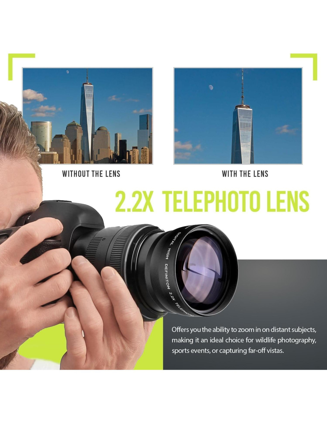 - Campo de Visión Telefoto 2.2x: Un lente telefoto estrecha el campo de visión, enfocándose en sujetos distantes.