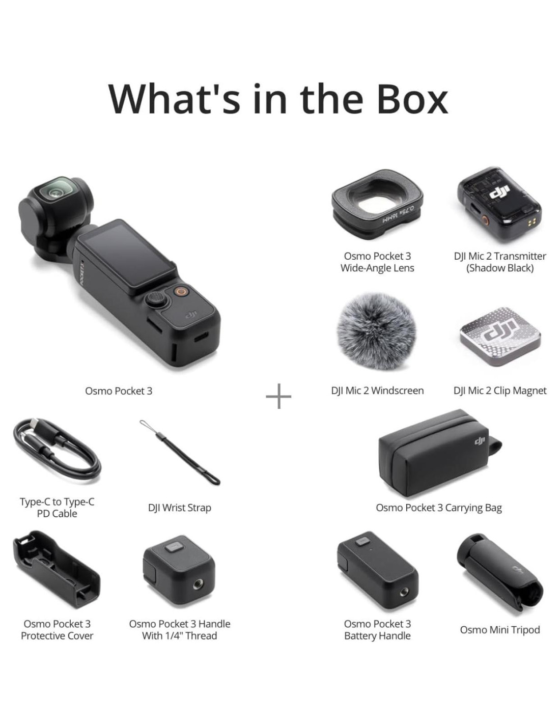 - EL PAQUETE INCLUYE: Cámara Gimbal DJI Osmo Pocket 3 CP.OS.00000302.01 | Mango de Batería | Mini Trípode | Lente Gran Angular | Transmisor DJI Mic 2 (Negro Sombra) | Paraviento | Clip Magnético | Cable PD Tipo-C a Tipo-C | Funda Protectora | Correa de Muñeca | Mango con Rosca de 1/4" | Bolsa de Transporte | Garantía Autorizada de DJI USA | Garantía Extendida CPS de 2 Años | Paquete de 2 Micrófonos de Solapa Mini Clip-On de 5 pies 3.5mm Deco Essentials | Estuche de Almacenamiento Organizador de Viaje EVA Duro Deco Gear de 10".