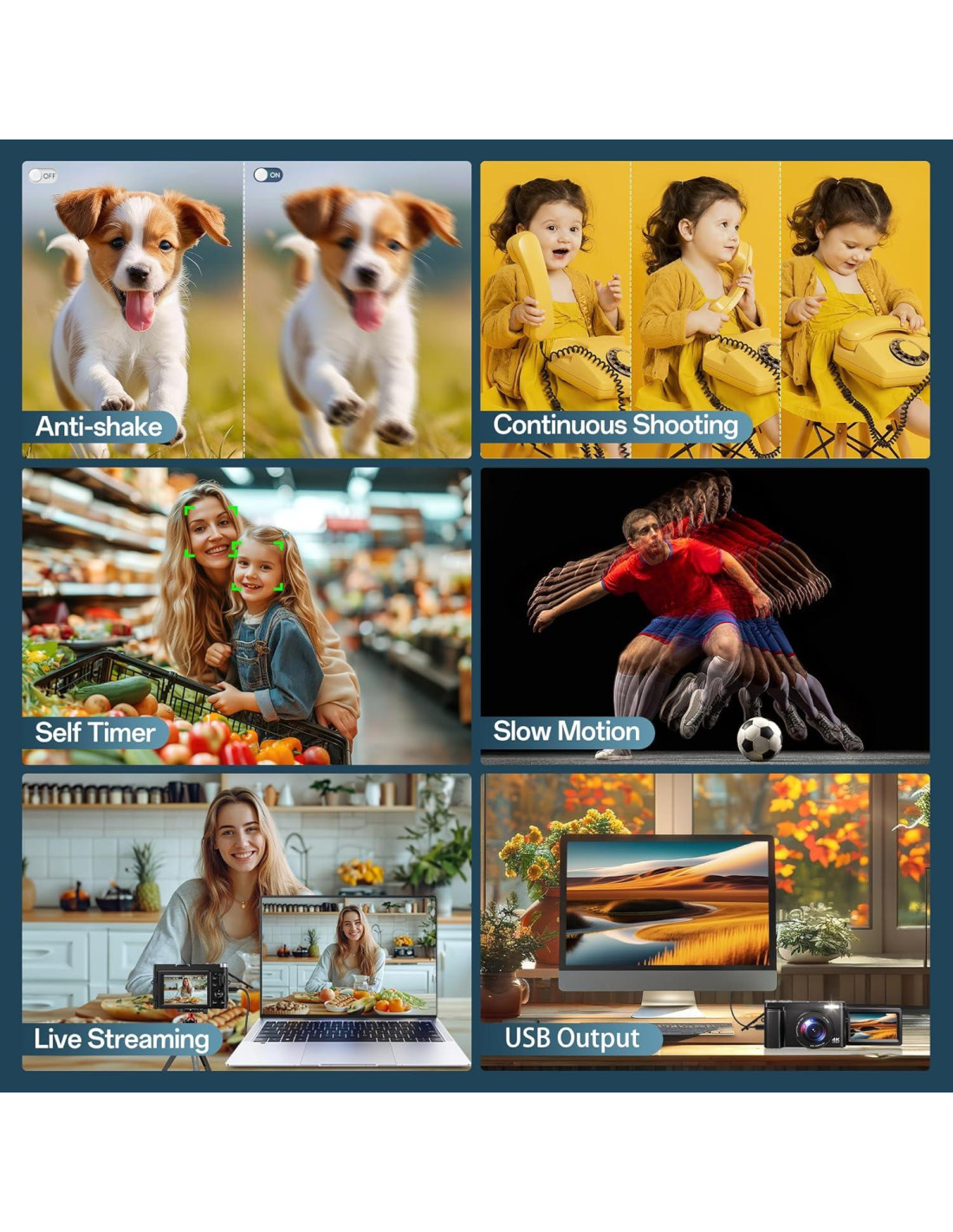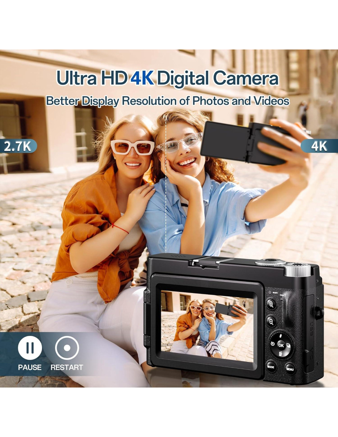 - [Cámara Digital 4K de 48MP] --- La cámara digital mejorada de 2025 tiene todos los modos que necesitas para fotografía o video, soporta resolución de imagen de 48MP y graba video en 4K Ultra HD con función de pausa, la resolución de 48MP ofrece imágenes nítidas y vibrantes, mientras que la función de grabación de video en 4K produce imágenes claras y de alta definición, la cámara digital 4K también viene con una tarjeta SD de 32GB, lista para su uso inmediato, lo que es una gran conveniencia, el zoom digital de 16x es perfecto tanto para principiantes como para creadores de contenido más experimentados.