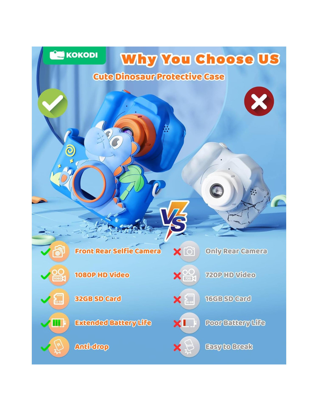 - [Funda Protectora Linda y Regalo Ideal] : Su funda protectora de dinosaurios está hecha de materiales de silicona no tóxicos que cumplen con los estándares internacionales de juguetes, resistente a golpes, anti-caída y duradera. La cámara de dinosaurios es un juguete ideal para niños de 3 a 9 años como regalo de cumpleaños/fiesta/Navidad, puede inspirar el deseo de los niños de explorar el mundo a través de sus ojos, cultivar sus intereses y pasatiempos que se convierten en fotógrafos. La cámara de video les permite tener un tiempo feliz y un mejor registro de la trayectoria de la infancia.
