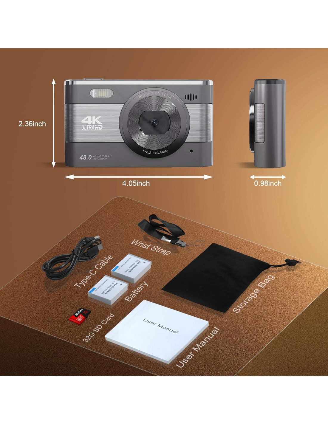 - Creación de Video 4K La cámara digital puede grabar video 4K/30fps de manera fluida, soporta funciones de lapso de tiempo y cámara lenta, brindándote una rica experiencia para grabar vlogs. Además, la cámara digital compacta 4K para fotografía puede usarse como una webcam, puedes chatear por video con familiares o amigos, así como hacer transmisiones en vivo en YouTube, Facebook, Twitter u otras redes sociales. Perfecta para que los adolescentes la lleven a campamentos de verano o a la escuela para grabar su vida.