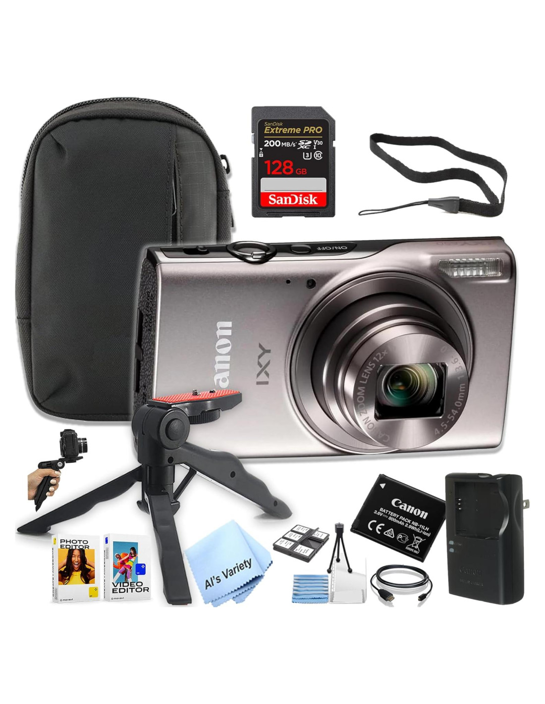 - Medios integrados: Canon PowerShot IXY 650 HS Cámara Digital (Negro), Paquete de Batería de Litio-Ion Canon NB-11LH para Cámaras Digitales PowerShot Seleccionadas (3.6V, 800mAh), Cargador Canon CB-2LF para Batería NB-11L, Correa de Muñeca WS-800, Tarjeta de Memoria SanDisk 128GB Extreme PRO UHS-I SDXC, Funda para Cámara, Trípode Gripster, Software de Edición de Foto/Video Movavi, Cable HDMi, Kit de Mantenimiento de Cámara, Paño de Limpieza de Lentes
