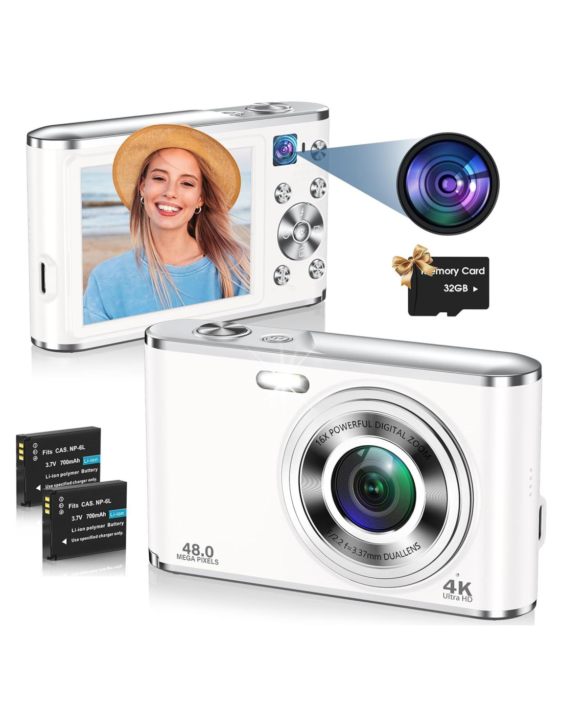 - Función de Autofocus y Cámara Digital UHD 4K - Cámara digital con Autofocus. Presiona el botón del obturador a la mitad para enfocar imágenes vívidas y nítidas. La mini cámara soporta fotos premium de 48MP y grabación de video 4K UHD. La tecnología CMOS mejorada asegura detalles precisos, capturando momentos vívidos para preservar tus experiencias memorables. (Incluye una tarjeta micro de 32GB, no es necesario comprar por separado)