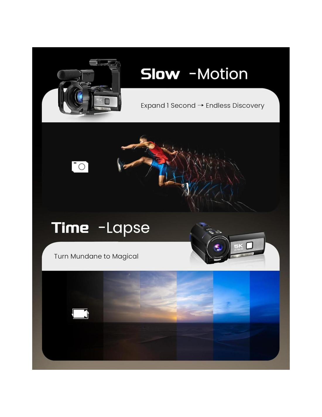 - Clareza Cinemática 5K y Versatilidad Esta cámara de video digital captura impresionantes videos de 5K/20fps (también 4K/60fps) y fotos de 64MP con un sensor CMOS de alta sensibilidad. Perfecta para vlogging, películas de viaje, eventos familiares y entrevistas, ofreciendo detalles de calidad cinematográfica incluso en movimiento.