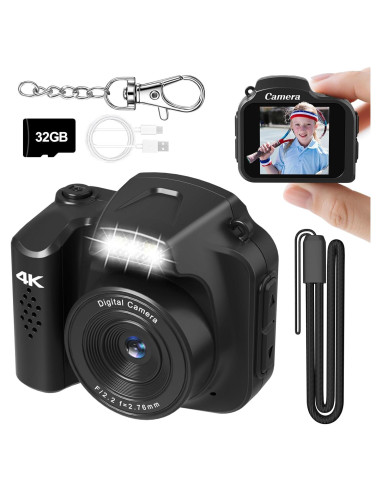 - Característica especial: Video 4K. Aprecia su tamaño compacto, facilidad de uso y portabilidad, notando que cabe bien en las llaves sin problemas. Disfrutan usando la Cámara Micro Compacta Portátil, con uno mencionando que la Mini Cámara Digital Retro hace que las cenas sean más divertidas en restaurantes.