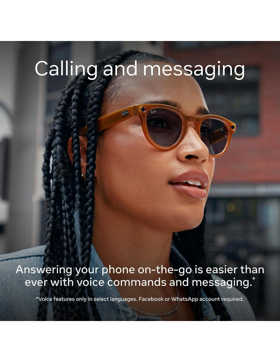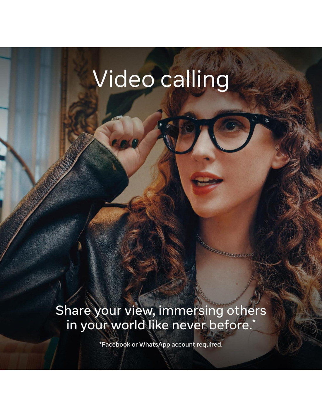 - Cambia entre la cámara de tu teléfono para hablar cara a cara o presiona dos veces tus gafas para compartir tu vista durante una videollamada, sumergiendo a otros en tu mundo como nunca antes.