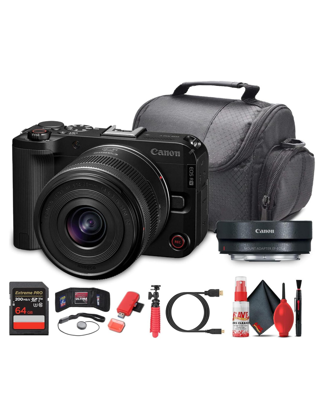 - Artículos incluidos: Cámara Canon EOS R50 V + Lente de Zoom Power 14-30mm, Adaptador de Montura Canon EF-EOS R, Tarjeta de Memoria SDXC UHS-I Extreme PRO de 64GB, Bolsa de cámara acolchada, Cable HDMI Micro, Trípode flexible, Kit de limpieza deluxe, Billetera para tarjeta de memoria, Lector de tarjeta de memoria, Cap Keeper.