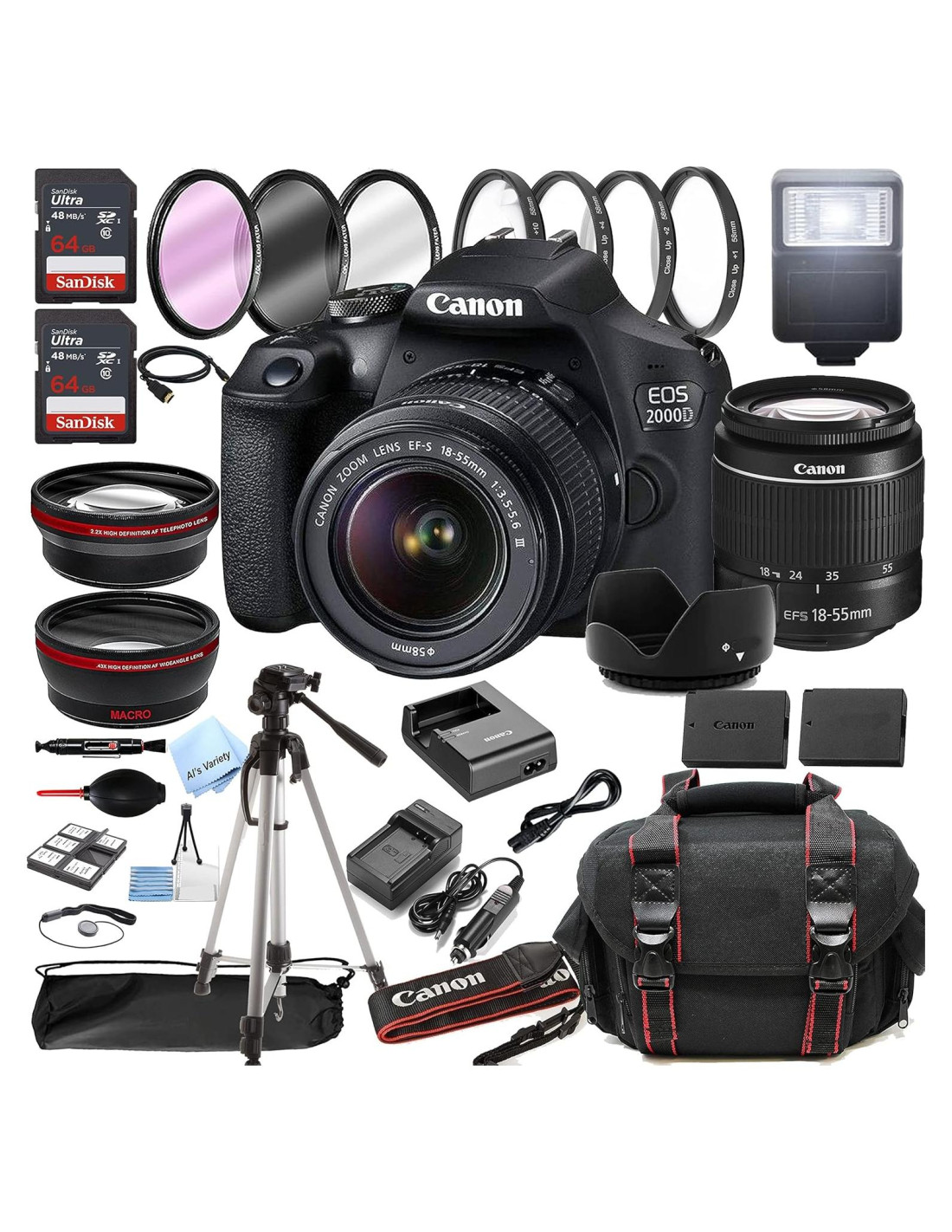 El paquete de la cámara DSLR Canon EOS 2000D incluye el lente 18-55mm, tarjeta de memoria de 128GB, trípode, filtros y funda para fotos y videos de alta calidad.