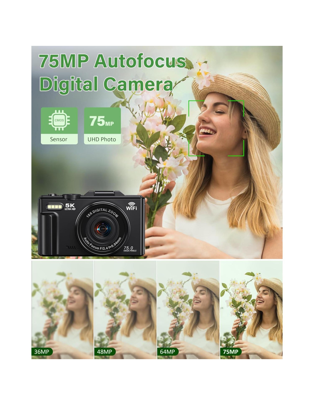 - [Resolución 5K UHD y Captura de Fotos de 75MP] Esta cámara digital ofrece un impresionante video 5K UHD y captura fotos de 75MP, lo que la convierte en una excelente opción para viajes, reuniones familiares y uso diario. Ya sea que estés al aire libre o relajándote en casa, trae cada detalle a la vida.