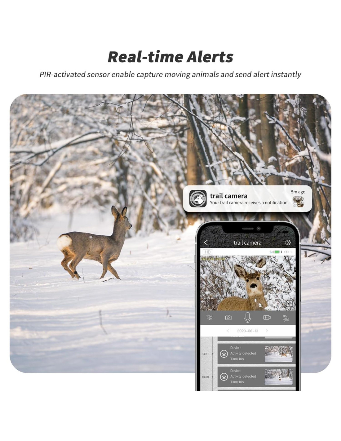 - 2K Video en Vivo y Acceso Remoto por Teléfono La cámara de trail celular SEHMUA te permite disfrutar de imágenes en 2K HD de ciervos, caballos, osos y otros en tiempo real con la aplicación Ucon. Y puedes acceder y configurar la cámara de trail celular de forma remota desde tu teléfono en cualquier momento y lugar. Lo más importante es que puedes comunicarte y compartir tus experiencias con amigos y familiares en tiempo real.