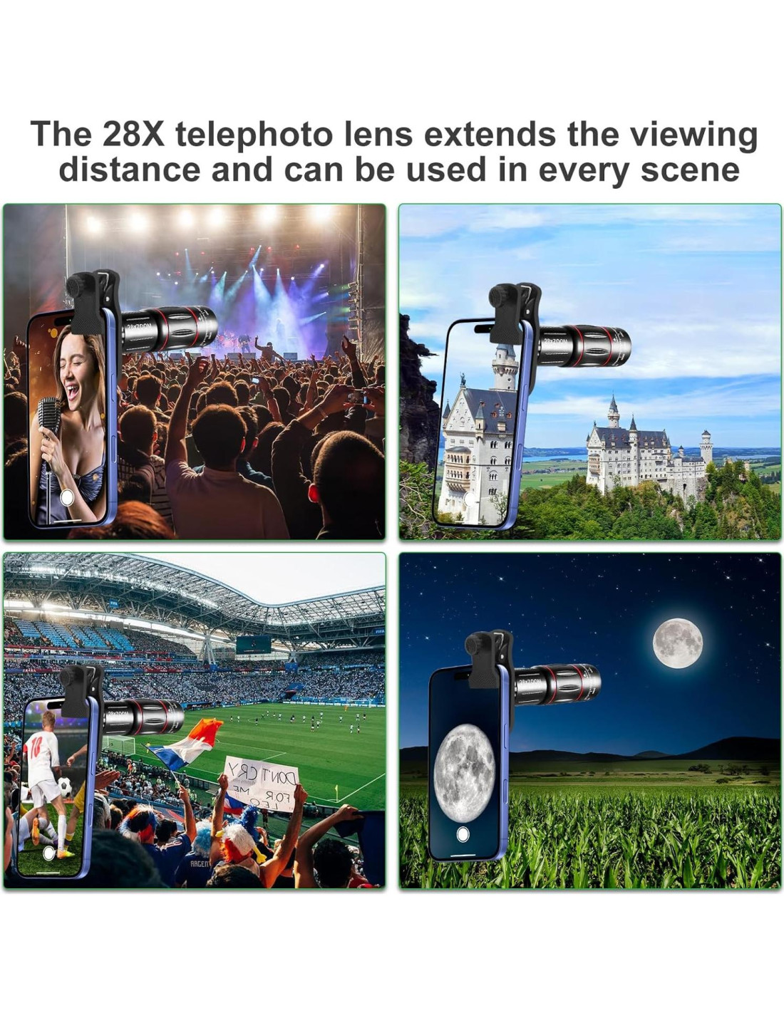 - [Telescopio HD] : 28 veces de disparo largo puede grabar objetivos claros, lente telefoto con una máscara ocular puede ser utilizada para disparos a larga distancia, se puede usar sin un teléfono como un solo ocular.
